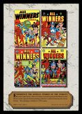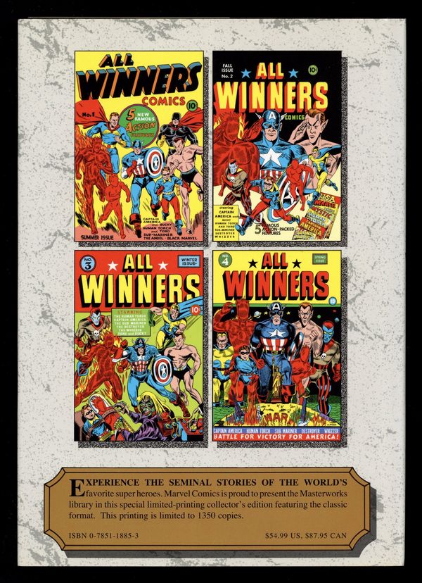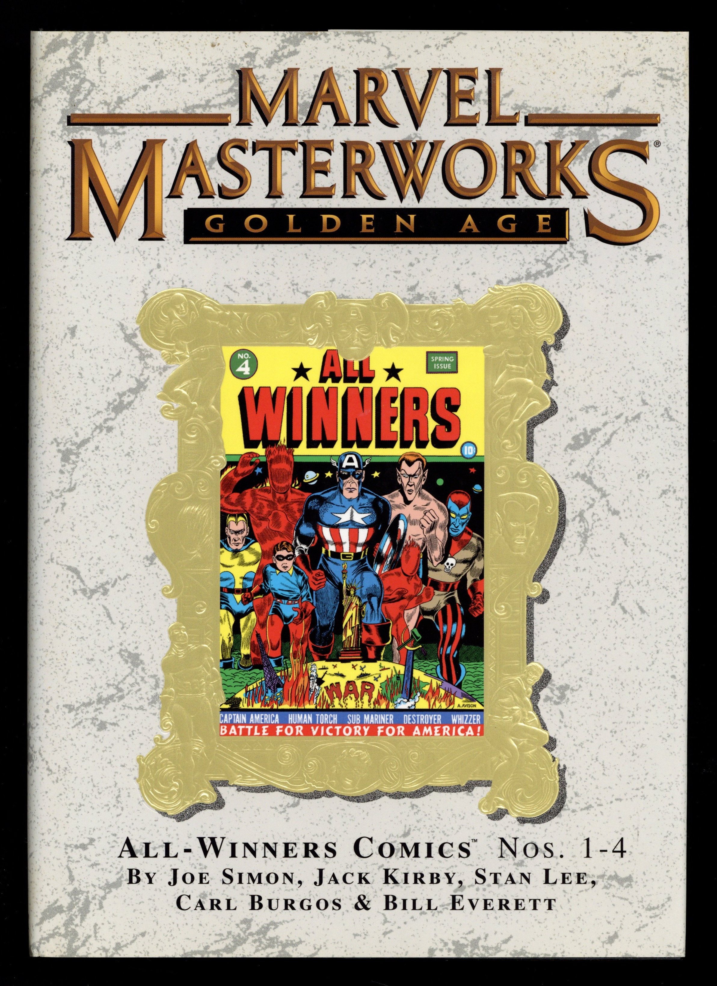 Volume 55 - 1st printing. "GOLDEN AGE ALL-WINNERS" Collects All-Winners Comics (1941) #1-4. Written by CARL BURGOS, STAN LEE, JACK KIRBY, JOE SIMON & BILL EVERETT. Art by CARL BURGOS, AL AVISON, JACK KIRBY, JOE SIMON, BILL EVERETT, JACK BINDER, PAUL GUSTAVSON, PAUL REINMAN, ALLEN SIMON, MIKE SEKOWSKY, JOHN FORTE, BOB POWELL, HOWARD JAMES & AL GABRIELE. Cover by ALEX SCHOMBURG. Introduction by Roy Thomas. Marvel Comics proudly presents more Golden Age greats, collecting the first four issues of ALL-WINNERS COMICS, from 1941-42 - newly remastered and restored. The Human Torch, Captain America, the Sub-Mariner, the Destroyer, the Whizzer and more battle for victory for America - both together and in solo adventures! Hardover, full color. Cover price $54.99.