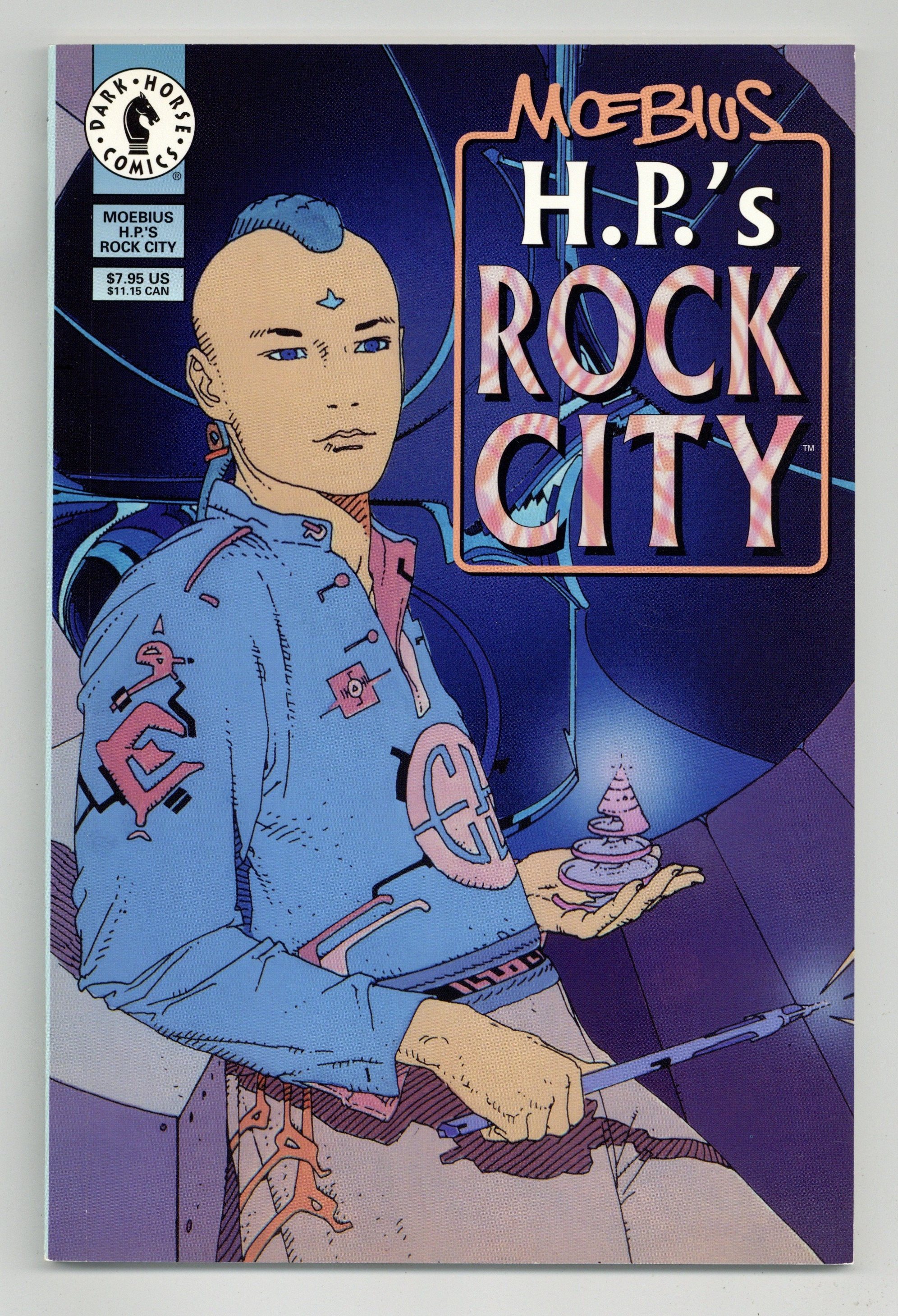 1st printing. Visit a city in which life is lived before the unblinking stare of surveillance cameras, but where dreams cannot yet be fettered. Take a stroll through streets where racists rule the night and the very air crackles with fear and paranoia. You've entered the mind of Moebius, France's master graphic-novel storyteller. H.P.'s Rock City is the newest collection of Moebius art and stories, including solo works and collaborations with other writers. The tales touch on such varied themes as hunting, feminism, rock-and-roll culture, nuclear war, and even Christmas! Moebius's collaborators include Dan O'Bannon (screenwriter of Alien) who wrote the sci-fi noir tale titled "The Long Tomorrow," and Philippe Druillet, who wrote the metaphysical science-fiction story "Approaching Centauri." This volume also includes story notes by Moebius, a must for any fan! Softcover, 6-in. x 9-in., 80 pages, Full Color. Cover price $7.95.