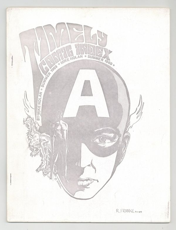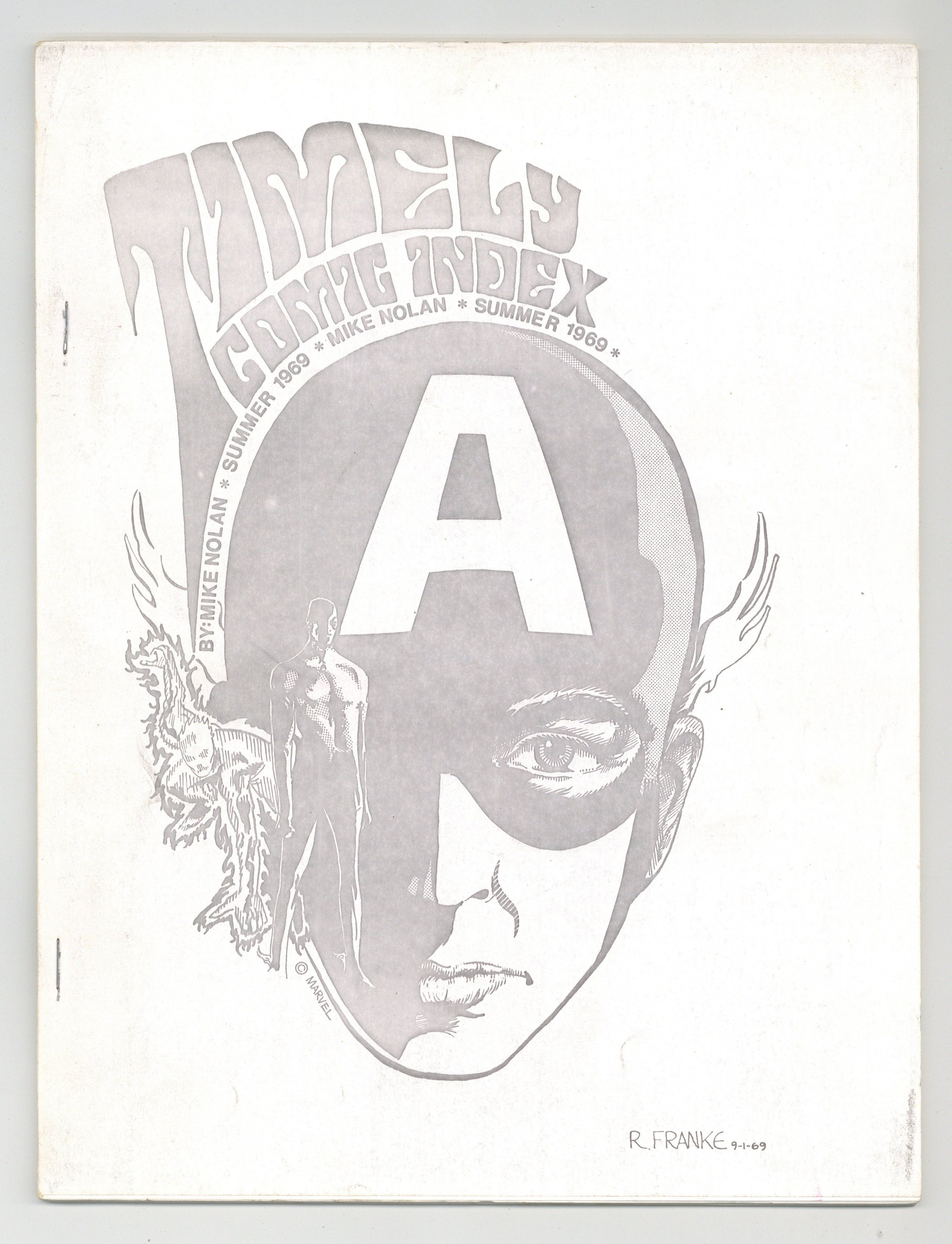Published Jun 1969 by Mike Nolan.$34.00Fanzine by Mike Nolan. Captain America cover by Rudi Franke. The first in depth index of all Timely super hero comics published with dates, story titles, appearances. 8 1/2-in. x 11-in., 36 pages, black and white all text.