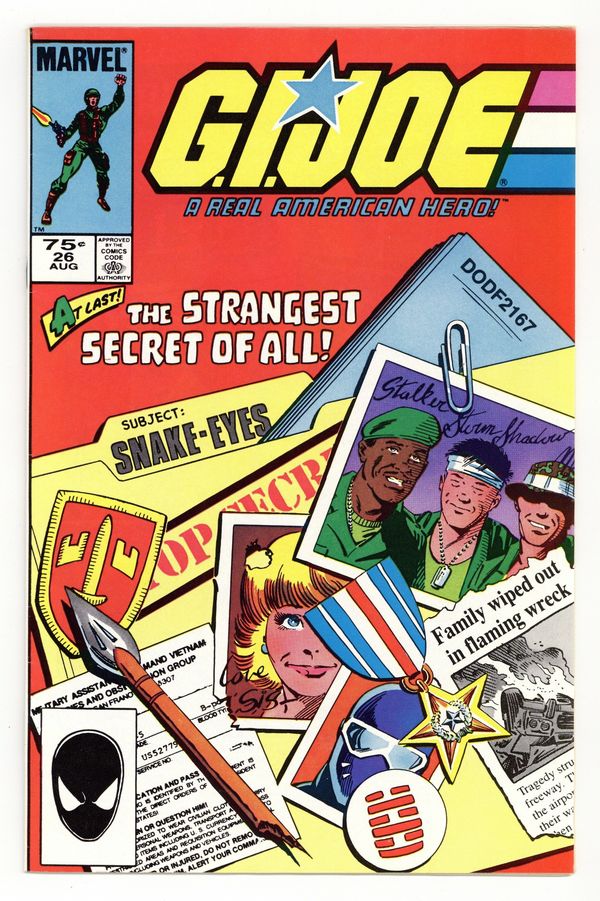 Tags: Canadian Price Variant$23.00Canadian edition with $.75 cover price. "Snake-Eyes: The Origin: Part 1 of 2!" Written by Larry Hama. Art by Larry Hama and Steve Leialoha. At last! The strangest most startling secret of all is revealed...THE ORIGIN OF SNAKE-EYES! 32 pages, FC. Cover price $0.75.