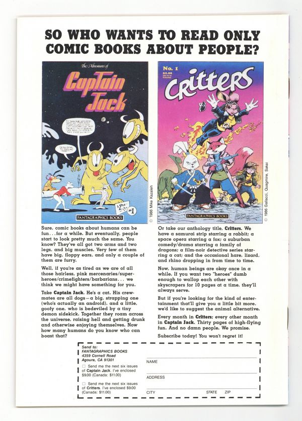 Published 1986 by SteelDragon Press.$34.001st printing ($1.75 cover price). "Omaha" the Cat Dancer is an erotic comic strip and later comic book created by artist Reed Waller and writer Kate Worley. Set in fictional Mipple City, Minnesota in a universe populated by anthropomorphic funny animal characters, the strip is a soap opera focusing on Omaha, a feline exotic dancer, and her lover, Chuck, the son of a business tycoon. Mature Readers. 28 pages. Cover price $1.75.