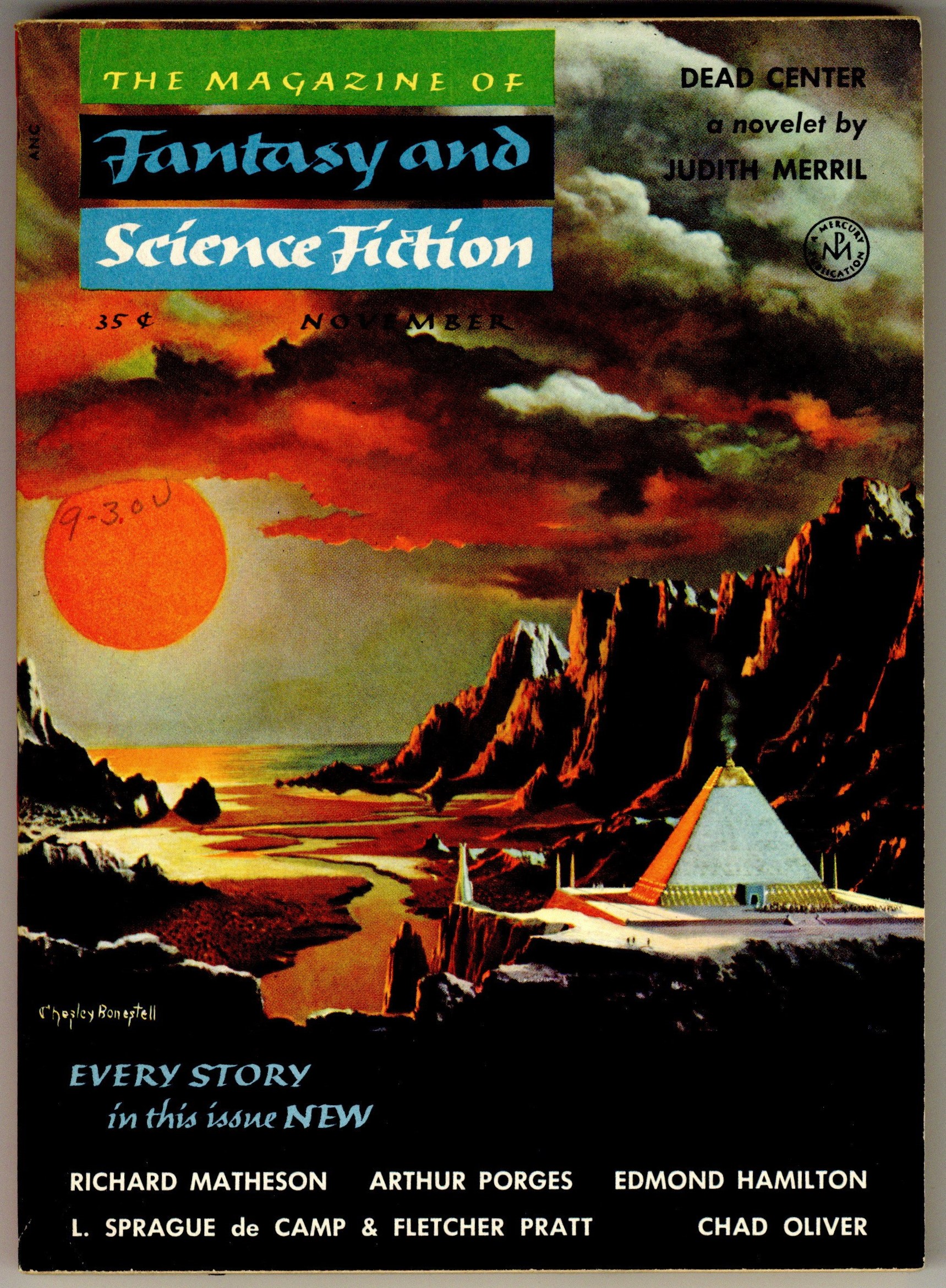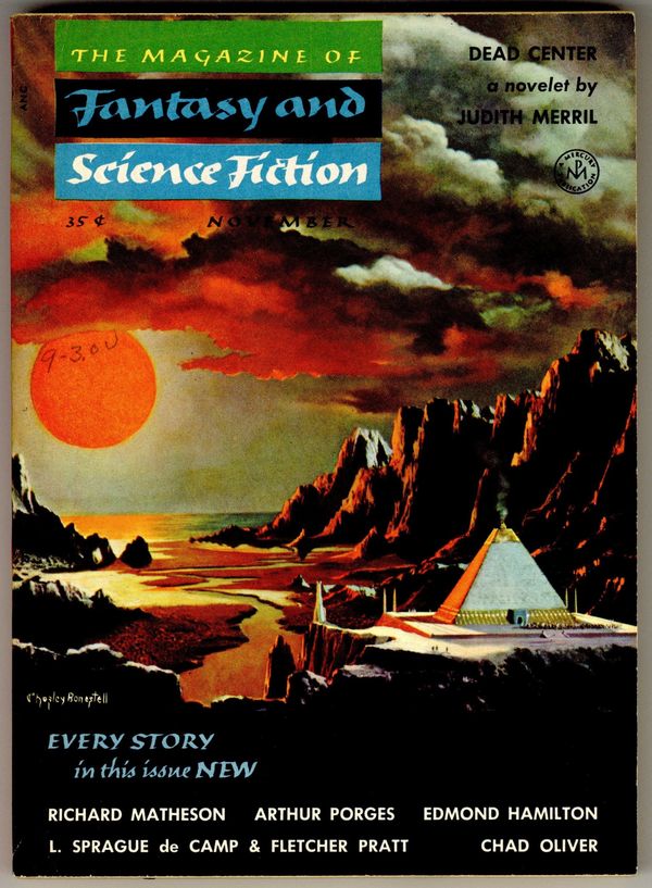 Published Nov 1954 by Mercury Publications.$7.80Volume 7, Issue 5 - November 1954. Cover by Chesley Bonestell. Fantasy and science fiction stories featuring "Dead Center" by Judith Merrill, and stories by Richard Matheson, Arthur Porges, Edmond Hamilton, L. Sprague de Camp, Fletcher Pratt and Chad Oliver. Softcover, 5.5-in. x 7.5-in.; 128 pages, B&W. Cover price $0.35.