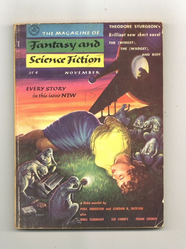 Published Nov 1955 by Mercury Publications.$7.80Volume 9, Issue 5 - November 1955. Cover by Edward Emsh. Fantasy and science fiction stories featuring "The[Widget], The [Wadget], and Boff" by Theodore Sturgeon, and stories by Poul Anderson, Gordon R. Dickson, Idris Seabright, Lee Correy, and Frank Gruber. Softcover, 5 1/2-in. x 7 1/2-in., 128 pages, B&W. Cover price $0.35.