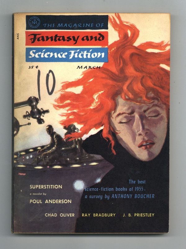 Volume 10, Issue 3 - March 1956. Cover by Nicholas Solovioff. Fantasy and science fiction stories including "Superstition" by Poul Anderson, and stories by Chad Oliver, Ray Bradbury, and J. B. Priestley. Softcover, 5 1/2-in. x 7 1/2-in., 128 pages, B&W. Cover price $0.35.