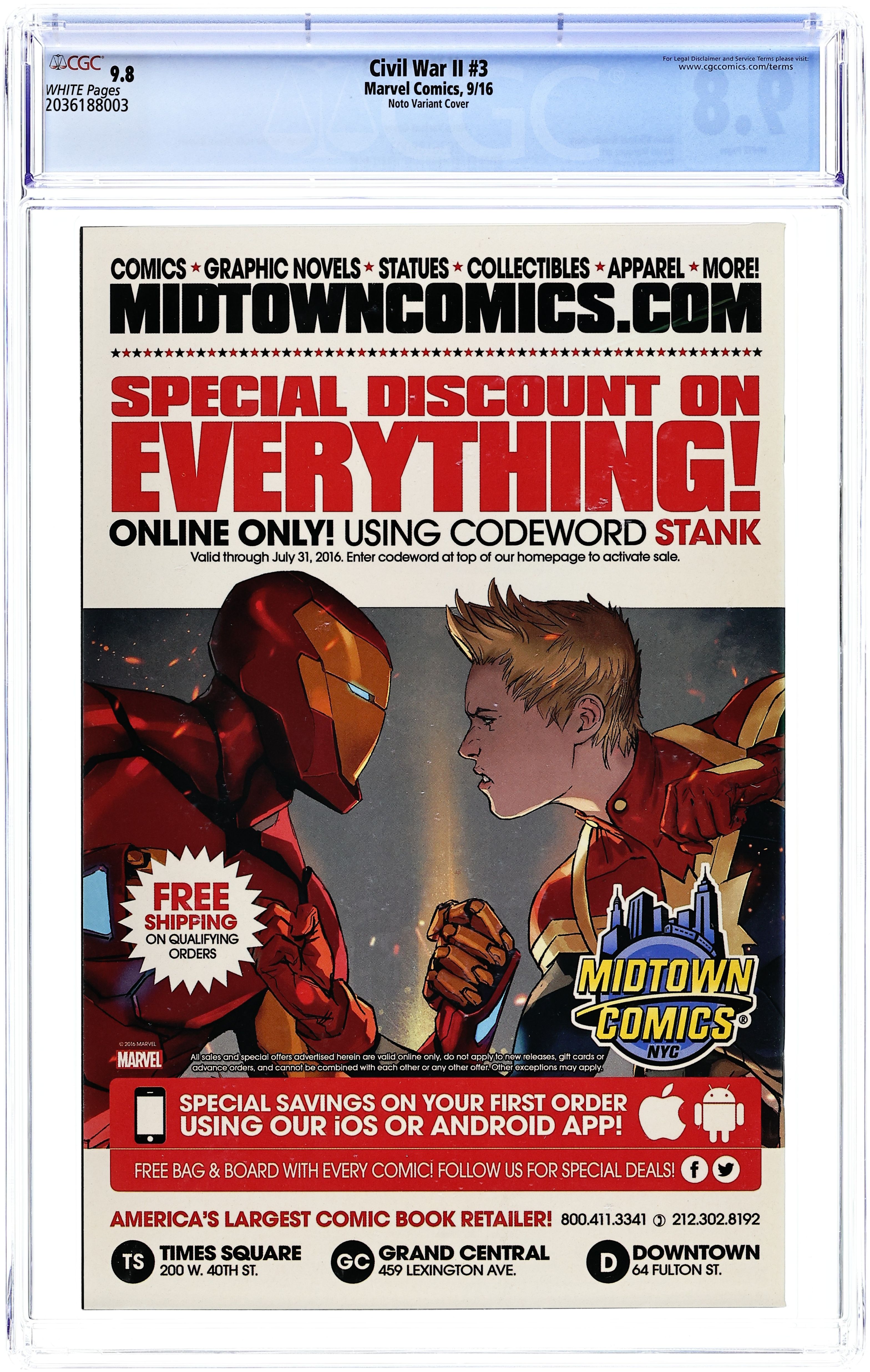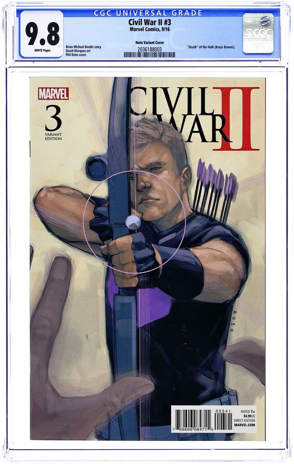 Limited 1 for 10 Retailer Incentive Variant Cover. Written by Brian Michael Bendis. Art by David Marquez. Cover by Phil Noto. This is the one everyone will be talking about! One of the biggest heroes in the Marvel Universe will fall! Who it is and how and why will divide fans for years to come. Will the heroes of the Marvel Universe survive the unthinkable happening? The fallout to this issue is enormous! 44 pages, full color. Rated T+ Cover price $4.99.