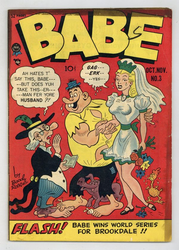 Hillbilly blonde Babe gets involved with a dying king and an ugly suitor; she leads her baseball team to the World Series for the first time. Story, art and cover by Boody Rogers. 52 pages. Cover price $0.10.