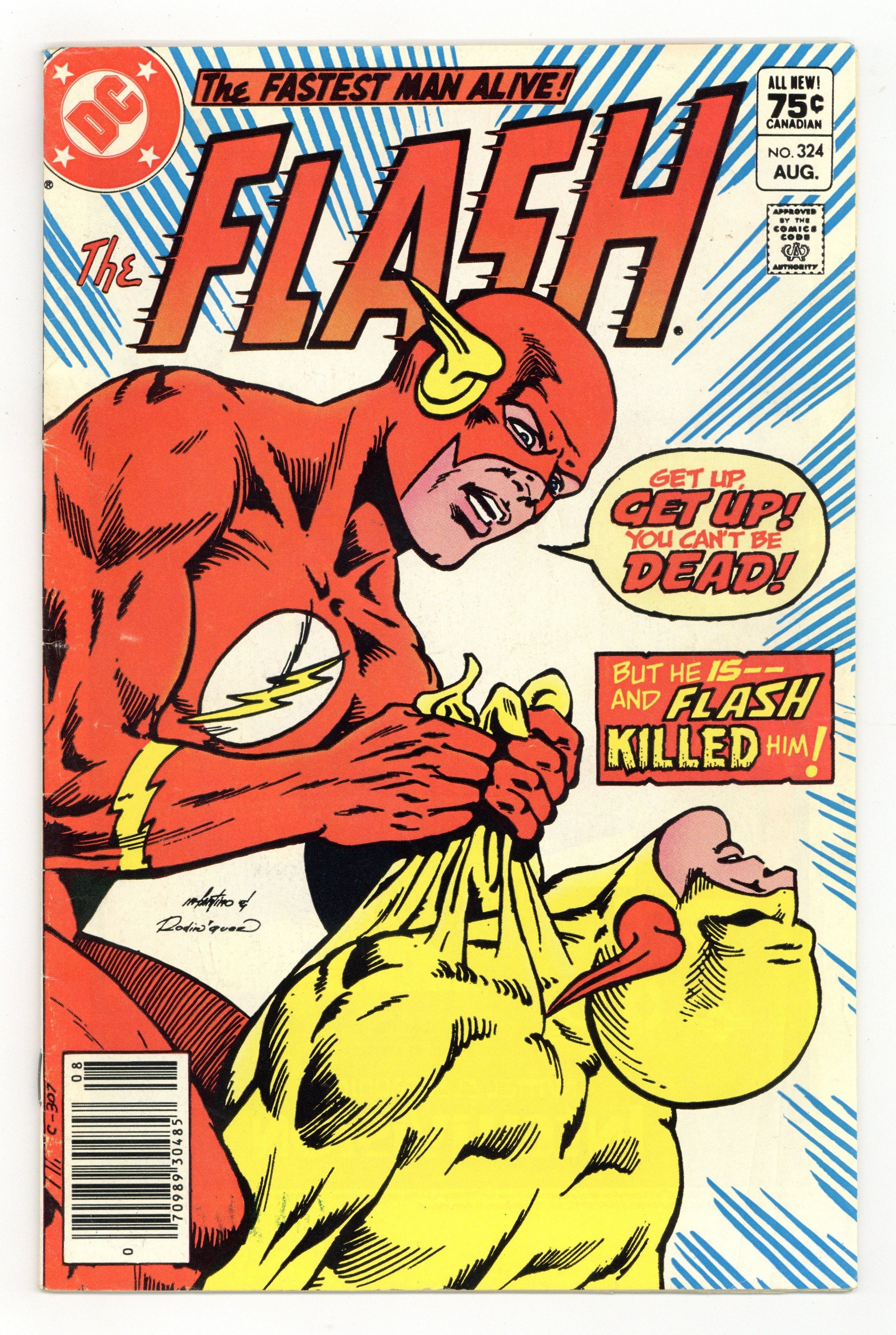Canadian edition with $.75 cover price. Cover pencils by Carmine Infantino, inks by Rodin Rodriguez. The Slayer and the Slain, script by Cary Bates, pencils by Carmine Infantino, inks by Dennis Jensen; While Fiona Webb waits at the altar, Flash engages in an epic battle with Reverse-Flash and ends up killing him to save Barry's bride to be; Kid Flash makes a guest appearance; This leads to the dominant story-line of the last 26 issues, the trial of Flash for the murder of Prof Zoom. Advanced Dungeons & Dragons Intellivision ad. Warlord toy ad from Remco. Batman and the Outsiders ad, art by Jim Aparo. Meanwhile… column by Dick Giordano. Universal Monsters model kits ad from Monogram. Tron Atari 2600 ad. 36 pgs. Cover price $0.75.