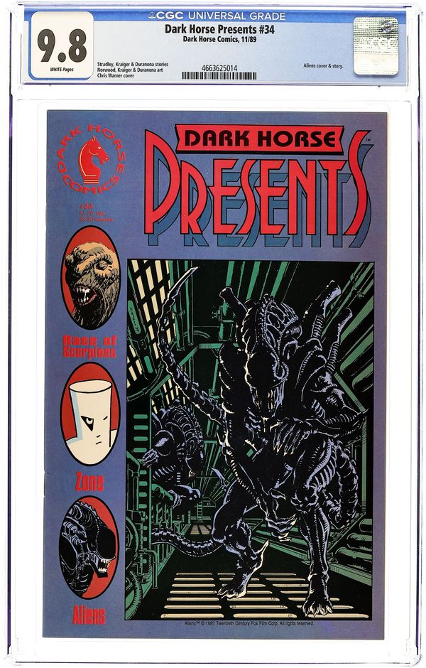 Cover by Chris Warner. This issue of Dark Horse's premier title features the fantastic climax of Book Two of Leopoldo Duranona's Race of Scorpions, the final episode of the current adventures of Michael Kraiger's radioactive misfit, The Zone, and a special Aliens story by Phil Norwood and Randy Stradley that will kick off one of Dark Horse's most exciting projects! 32 pages, B&W. Cover price $1.75.