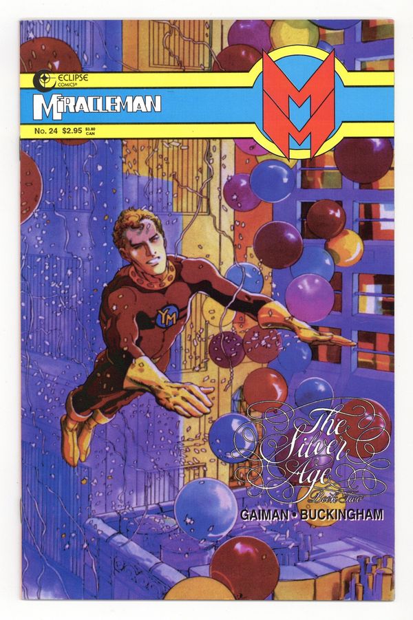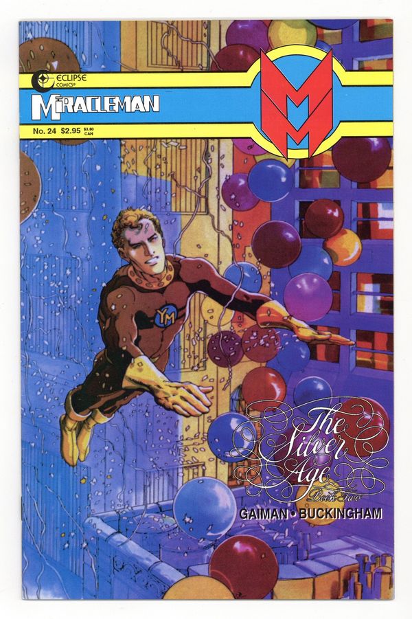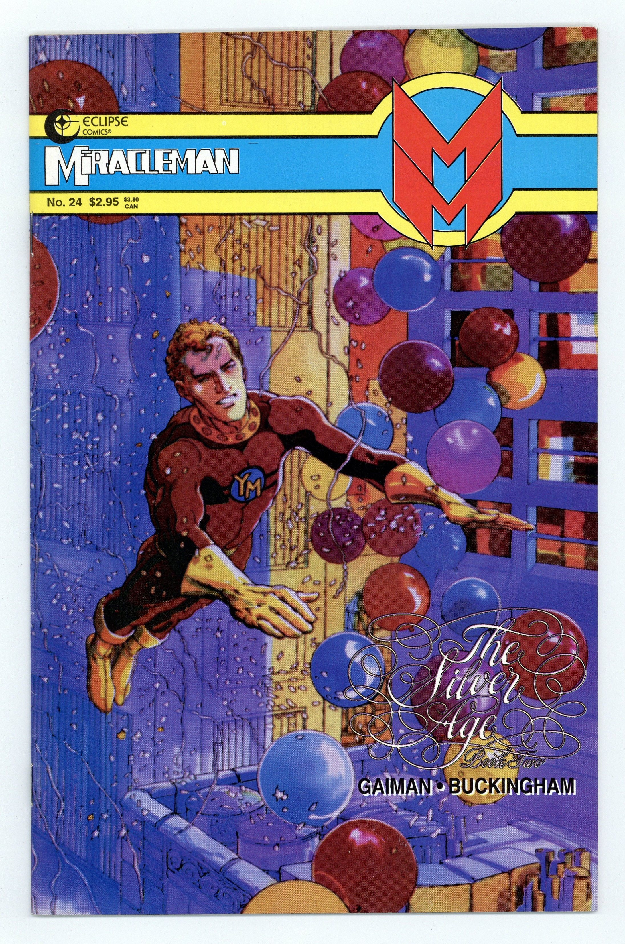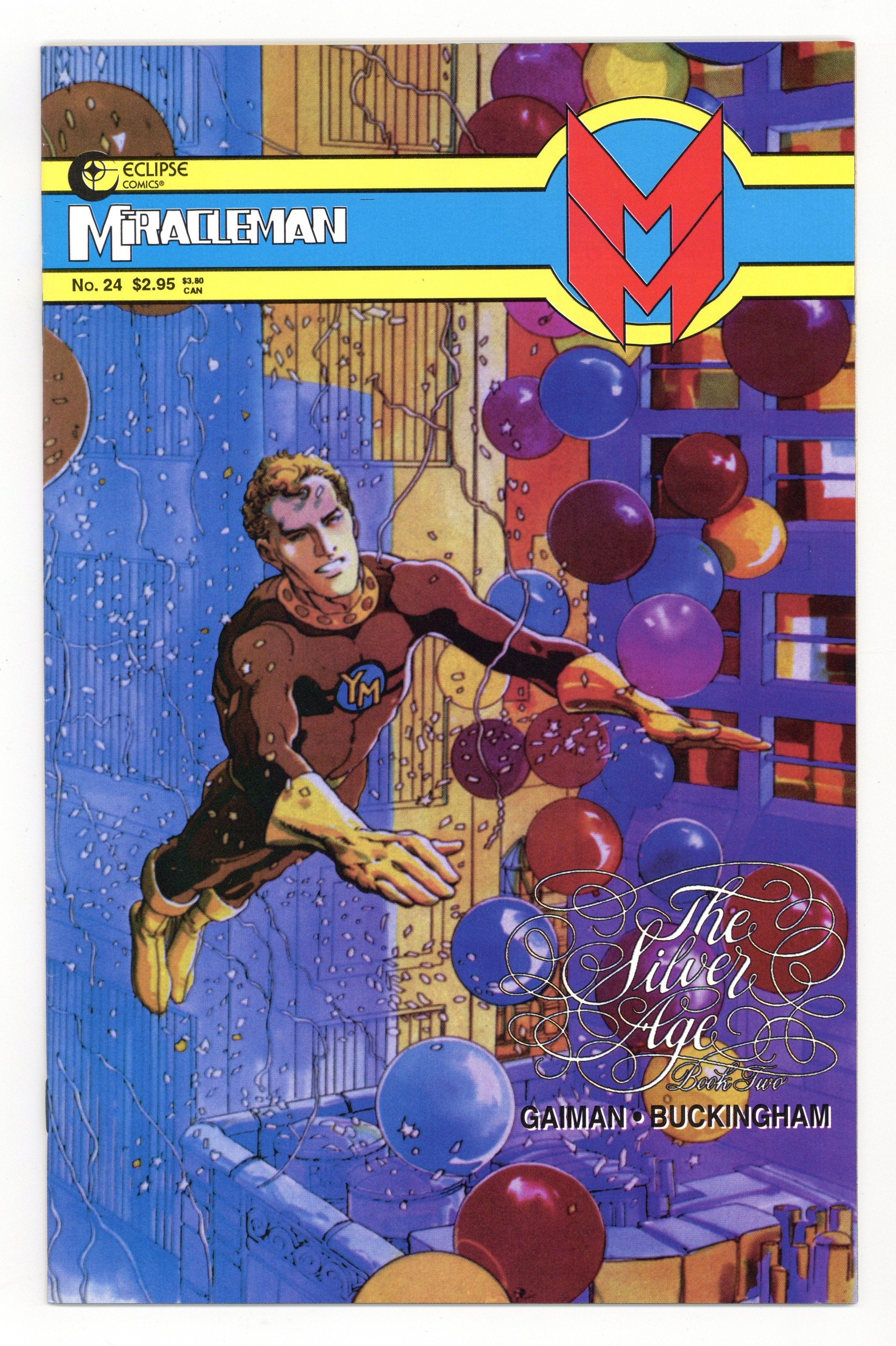 When Titans Clash - Written by Neil Gaiman. Art by Mark Buckingham. Cover by Barry Windsor-Smith. The Silver Age continues with Book Two! Characters in this issue: Young Miracleman, Miracleman, Miraclewoman, Winter Moran, Jordan (introduction), Warpsmiths (Kana Blur, Phon Mooda), Panorama, Kay, The Zapster and Jenda. Plus: Pin-ups by Brady Gorby, Dan Brereton and D'Israeli. 32 pages, full color. Cover price $2.95.