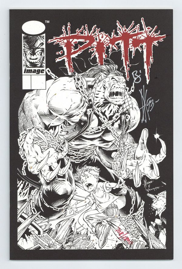 Includes COA. Black Colored Deluxe Ashcan Edition. Signed and numbered by writer Brian Hotton & creator/penciler Dale Keown and limited to 1800 copies. Originally distributed with a numbered certificate of authenticity from Dale Keown. Contains pages 12-23 of story from Pitt (1993 Image/Full Bleed) #1 and pages 1-8, 12 & 13 from Pitt (1993 Image/Full Bleed) #2. 5.5-in. x 8.5-in. B&W, 24 pages.