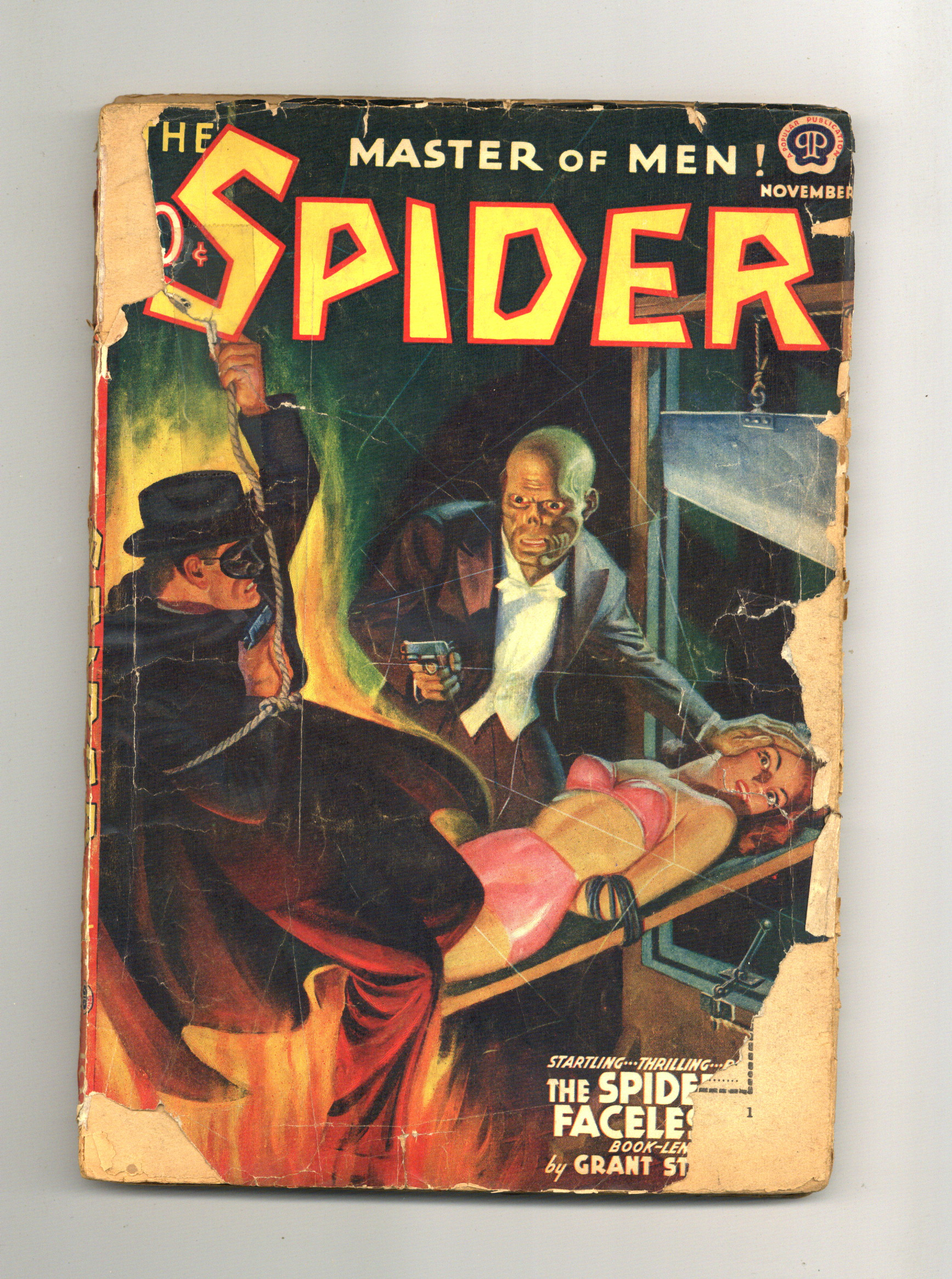Nov 1939. Spider Story by Grant Stockbridge "The Spider and the Faceless One". "Corpse Inspector" by Arthur Leo Zagat. Illustrations by J. Fleming Gould. 7" x 10", black and white; 112 newsprint pages. Cover price $0.10.