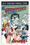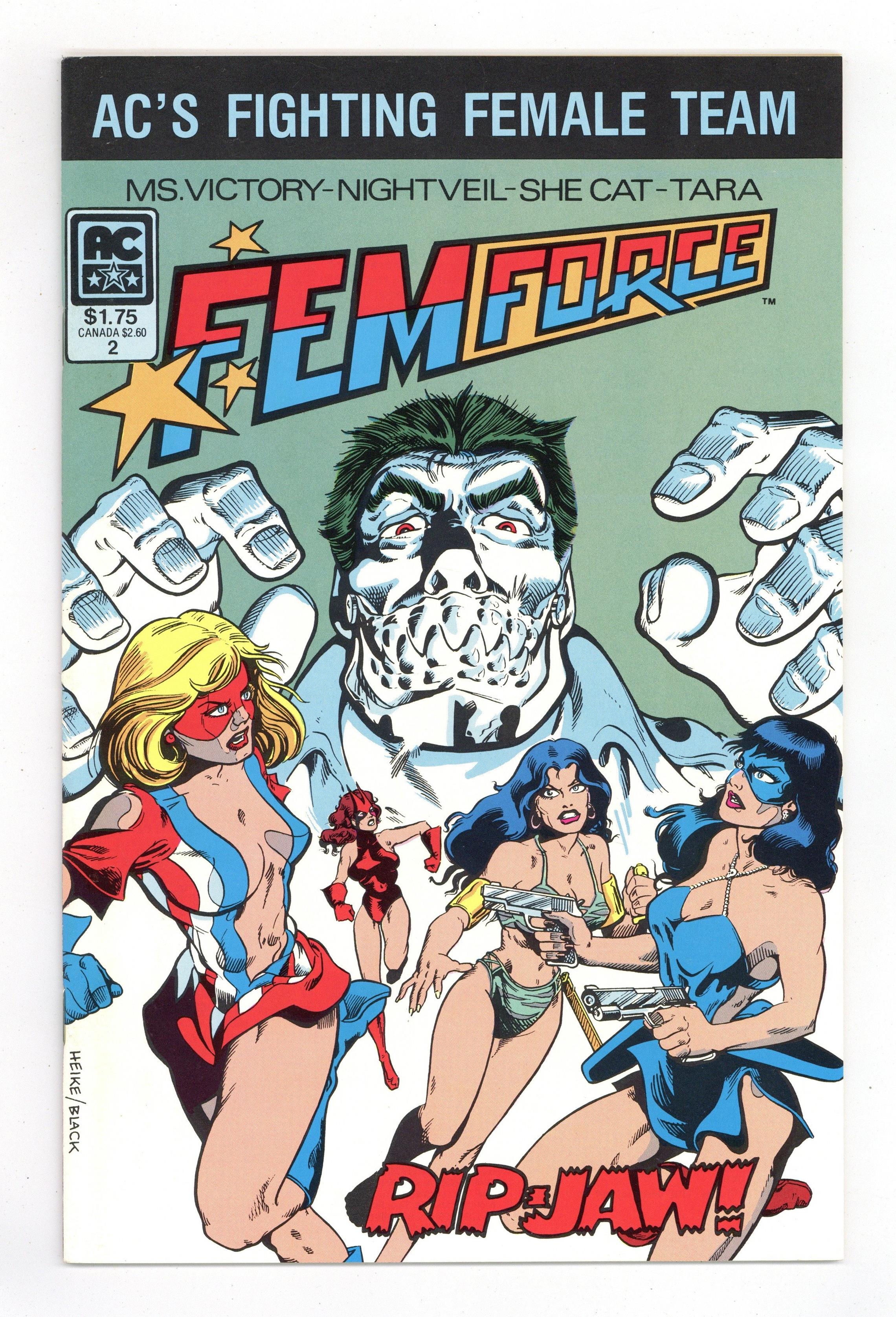 Published 1985 by Americomics (AC).$9.00Cover pencils by Mark Heike, inks by Bill Black. A Gentleman Named Ripjaw, script and ink by Bill Black, pencils by Mark Heike; An escape from capture by giant women, a short jaunt back to prehistoric times and the origin of the man with metal dentures are only the beginning, before the Femforce finally save the day and bring back Dr. Jimenez' Time Triangle; Guest-starring Colt, Satch and Wallow, Jennifer Wayne-Burke, and the first appearance of Reggie Blodgett. Pursuit starring the Last Detective, script by Mark Propst, pencils by Mark Propst, inks by Jim Sanders III. 36 pgs. $1.75. Cover price $1.75.
