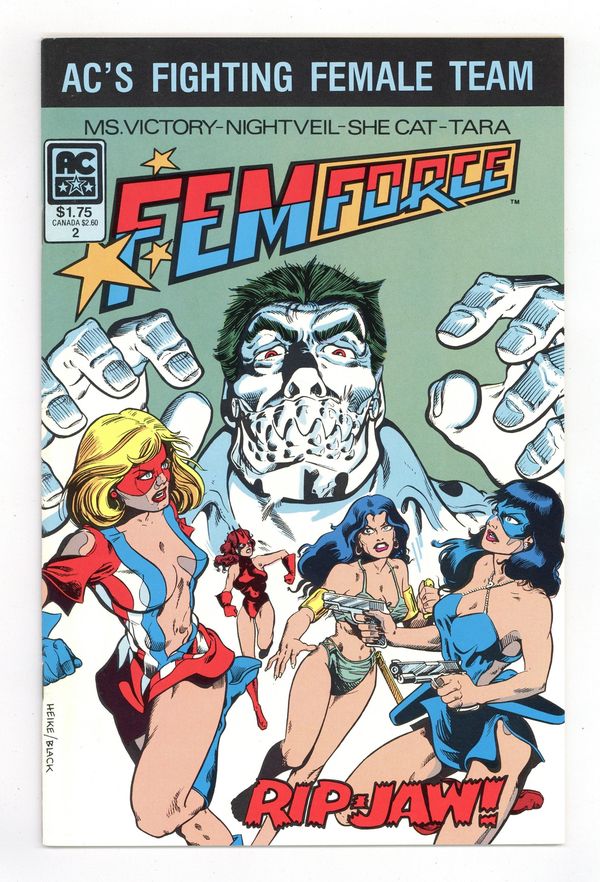 Published 1985 by Americomics (AC).$7.00Cover pencils by Mark Heike, inks by Bill Black. A Gentleman Named Ripjaw, script and ink by Bill Black, pencils by Mark Heike; An escape from capture by giant women, a short jaunt back to prehistoric times and the origin of the man with metal dentures are only the beginning, before the Femforce finally save the day and bring back Dr. Jimenez' Time Triangle; Guest-starring Colt, Satch and Wallow, Jennifer Wayne-Burke, and the first appearance of Reggie Blodgett. Pursuit starring the Last Detective, script by Mark Propst, pencils by Mark Propst, inks by Jim Sanders III. 36 pgs. $1.75. Cover price $1.75.