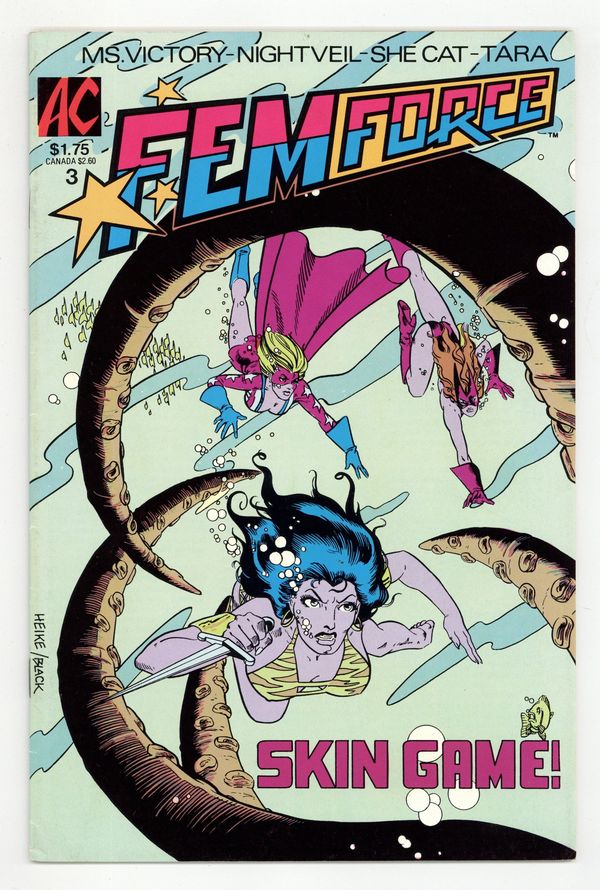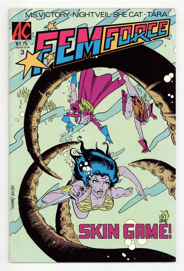 Published 1985 by Americomics (AC).$8.80Cover pencils by Mark Heike, inks by Bill Black. Skin Game, script and inks by Bill Black, pencils by Bill Black, Mark Heike, and Mark Propst; Blue Bulleteer returns to her normal state as Nightveil, and the Femforce go to the underwater city of Oceanus One to track down a gang of smugglers whose trail starts at Tara's Jungle Island refuge; But are the bad guys after exotic animals--or gold? Moon's Mind Masquerade: Part 1, script by Paul Daly, art by Rick Burkett. 36 pgs. $1.75. Cover price $1.75.