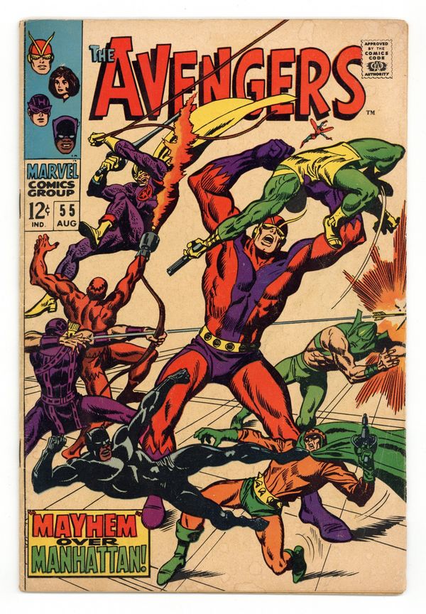 First (full) appearance of Ultron in "Mayhem over Manhattan!" Part 2 of 2. Guest-starring the Black Knight. Script by Roy Thomas. Pencils by John Buscema. Inks by George Klein. Cover by John Buscema and George Roussos. One of the legendary issues of the Avengers! As Earth's Mightiest Heroes battle their greatest foe for the first time! But at this point, they don't know who or what Ultron-5 is! The four avengers are still reeling from Jarvis' betrayal, the Masters of Evil's victory, and the Crimson Cowl's identity! However Ultron doesn't care about the Avengers' confusion! Because he's just loaded them inside a hydrogen bomb... and set the bomb on a collision course with the Empire State Building! Oh my, this looks like curtains for Earth's Mightiest! Unless the resourceful Black Knight and remorseful Edwin Jarvis can think of something quick! Appearances by Aragorn, Klaw, Melter, Whirlwind, and the Radioactive Man. Avengers Lineup: Black Panther, Goliath, Hawkeye, and the Wasp. (Notes: Ultron returns in Avengers #57. This issue was reprinted in Marvel Super Action #14. This two-part story was reprinted in 1993 in the trade paperback: The Greatest Battles of the Avengers.) 36 pages. Cover price $0.12.