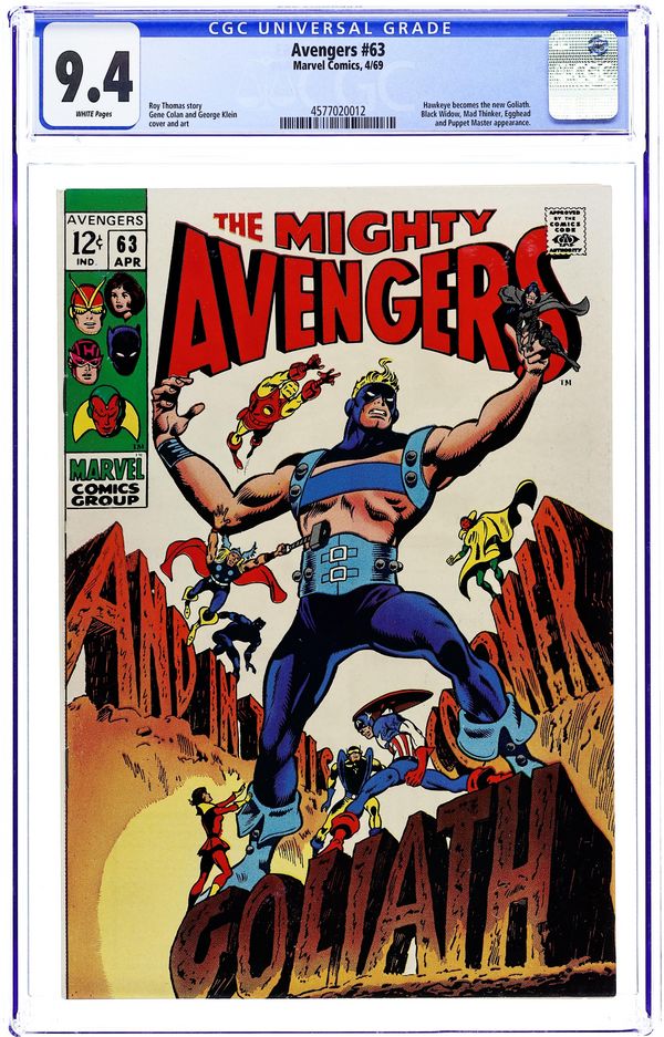 "And in This Corner...Goliath!" Part 1 of 3. Script by Roy Thomas. Pencils by Gene Colan. Inks by George Klein. Cover by Gene Colan and George Klein. Clint Barton takes center stage as he changes identities after receiving a distress call from the Black Widow! Exit Hawkeye...and enter Goliath! A new super-villain triumvirate has taken the Widow prisoner and crafted a plan to conquer the United States! With his fellow Avengers away on a phony mission, Clint storms into Coney Island to rescue Natasha all by himself! But the Mad Thinker's massive android stands in his way! Will the new Goliath be cut down to size on his very first adventure? Avengers Lineup: Black Panther, Hawkeye/Goliath, Vision, Wasp, and Yellowjacket. (Notes: Elements of the plot continue from Captain Marvel (1st series) 12 and continue in Sub-Mariner (1st series) 14. Egghead previously appeared in Tales to Astonish 61. The Puppet Master and Mad Thinker appear next in Sub-Mariner 14.) 36 pages. 12 cent cover price. Cover price $0.12.