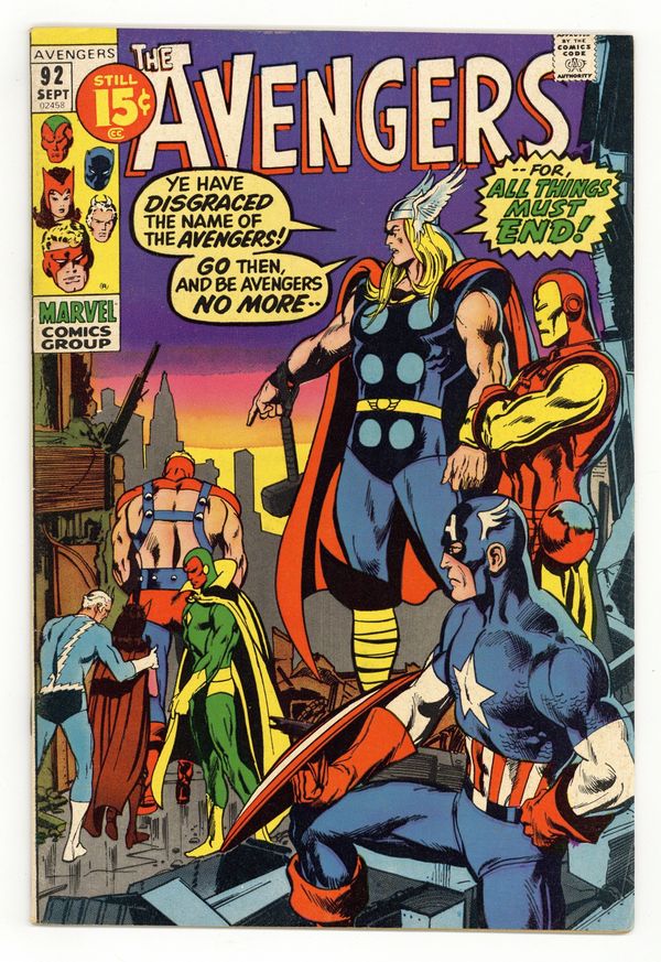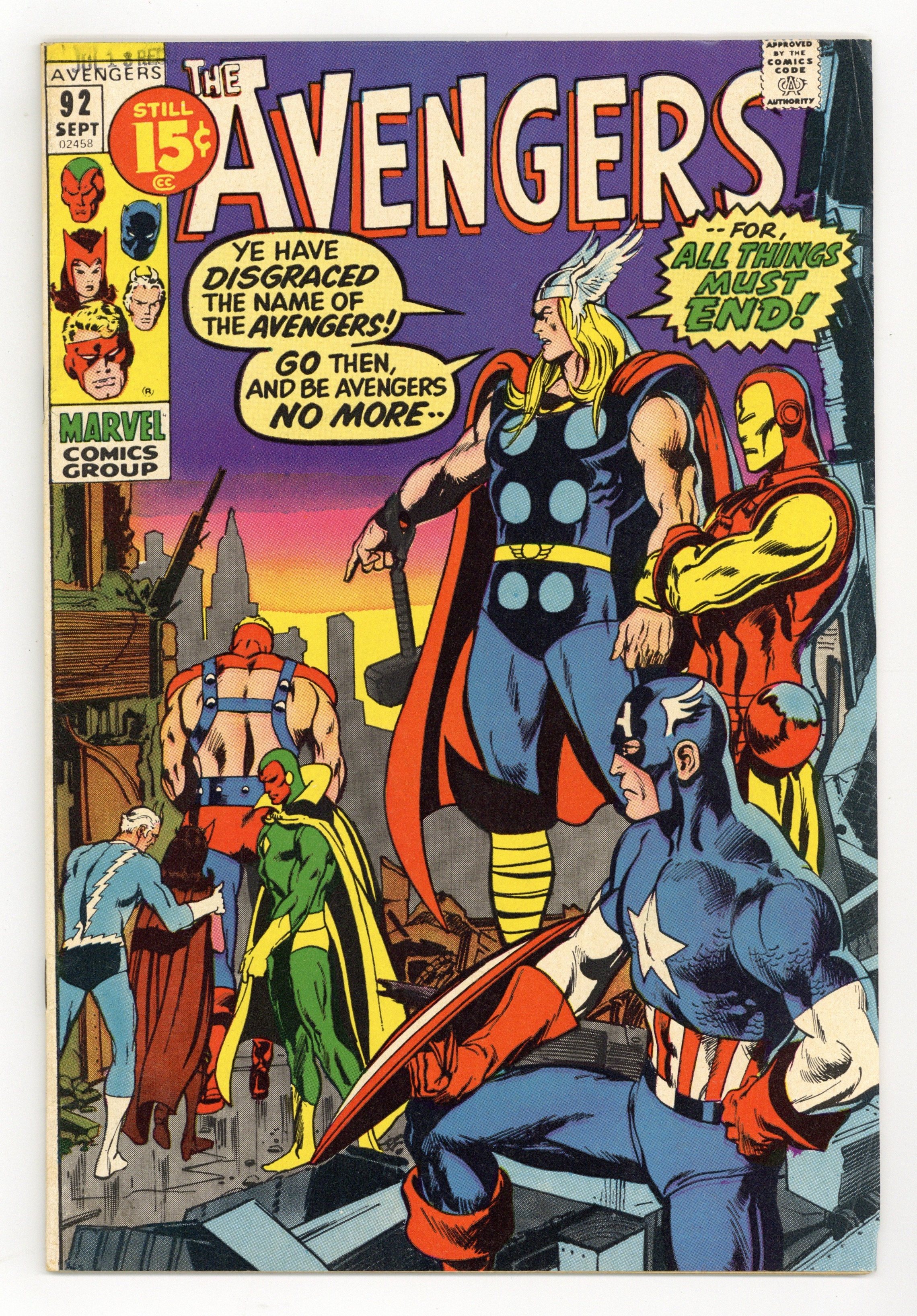 "All Things Must End!" Part 4 of 9. Guest-starring Captain Marvel. Script by Roy Thomas. Pencils by Sal Buscema. Inks by George Roussos. Cover by Neal Adams and Tom Palmer. The Avengers' Alaskan adventure is over, but the fallout from their clash with the Kree is just beginning! The federal government is incensed that Earth's Mightiest Heroes are protecting Captain Marvel after the aborted Kree invasion! So the Alien Activities Commission summons the Avengers to testify! But the political deck is stacked against the heroes and the national sentiment turns against them! When the four avengers return to Fifth Avenue, they're shocked to see their mansion ransacked! And shocked again when Cap, Thor, and Shell-head kick them out of it! What a stunning turn of events! Where do Wanda, Pietro, Goliath, and the Vision go from here? Cameo appearances by Nick Fury, Dum Dum Dugan, Mr. Fantastic, the Thing, and the Super-Skrull. Avengers Lineup: Goliath, Quicksilver, Scarlet Witch, and the Vision. Last 15¢ issue. (Notes: This issue features a classic Neal Adams cover (with inks by Tom Palmer) -- perhaps the most well-known of the five covers that Adams drew for the Avengers title. The letters page contains a letter from comics writer David Michelinie.) 36 pgs. Cover price $0.15.
