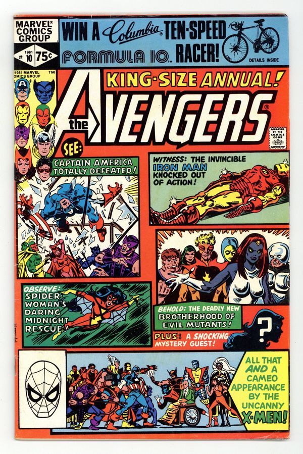 Direct Edition. First appearance of Rogue and Madelyne Pryor in "By My Friends Betrayed!" Spider-Woman, X-Men, Carol Danvers, and New Brotherhood of Mutants guest star. Script by Chris Claremont. Pencils by Michael Golden. Inks by Armando Gil. Cover by Al Milgrom. This action-packed annual has got it all, true believers: the first appearance of Rogue, the spectacular art of Michael Golden, the tragic return of Carol Danvers, and the stupendous struggle between the Brotherhood of Evil Mutants and the mighty Avengers! Following the events of Uncanny X-Men #142, Mystique & her New Brotherhood of Evil Mutants attempt to break four of their members out of Ryker's Island prison! After Rogue and Mystique take down Captain America, Iron Man, and Thor, the rest of the Avengers and Spider-Woman catch up to the villains, and the epic clash erupts! Woven in and around the frantic action at Ryker's Island is the heartbreaking story of Carol Danvers' return to Earth. Her life has fallen apart since leaving for Limbo with Marcus Immortus in Avengers #200, and now, stripped of her powers and memories, Carol begins the long road to recovery. And the first step is an emotional confrontation with her former teammates! Notes: Marvel Super-Heroes #11 (Fall 1992) fills in the details of Carol Danvers' life between Avengers #200 and Avengers Annual #10. The Thing stars in a one-page Hostess ad, "A Lesson to Be Learned!" This issue was reprinted in 1993 in the trade paperback: The Greatest Battles of the Avengers. 52 pages, full color. Cover price $0.75.