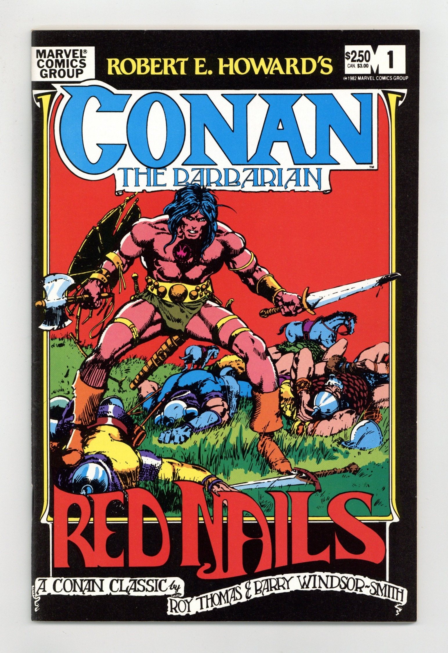 $16.00Giant-size issue; no ads. Reprints "Red Nails" (from Savage Tales 2 & 3) in color by Roy Thomas and Barry Windsor-Smith (adapted from the Robert E. Howard story). Also reprints the REH poem "Cimmeria" (from Savage Tales 2) in color, adapted by Windsor-Smith. Two-page introduction by Alan Zelenetz. Windsor-Smith covers (front reprinted from Conan the Barbarian 21; back reprinted from Conan the Barbarian Annual 1). Cover price $2.50.