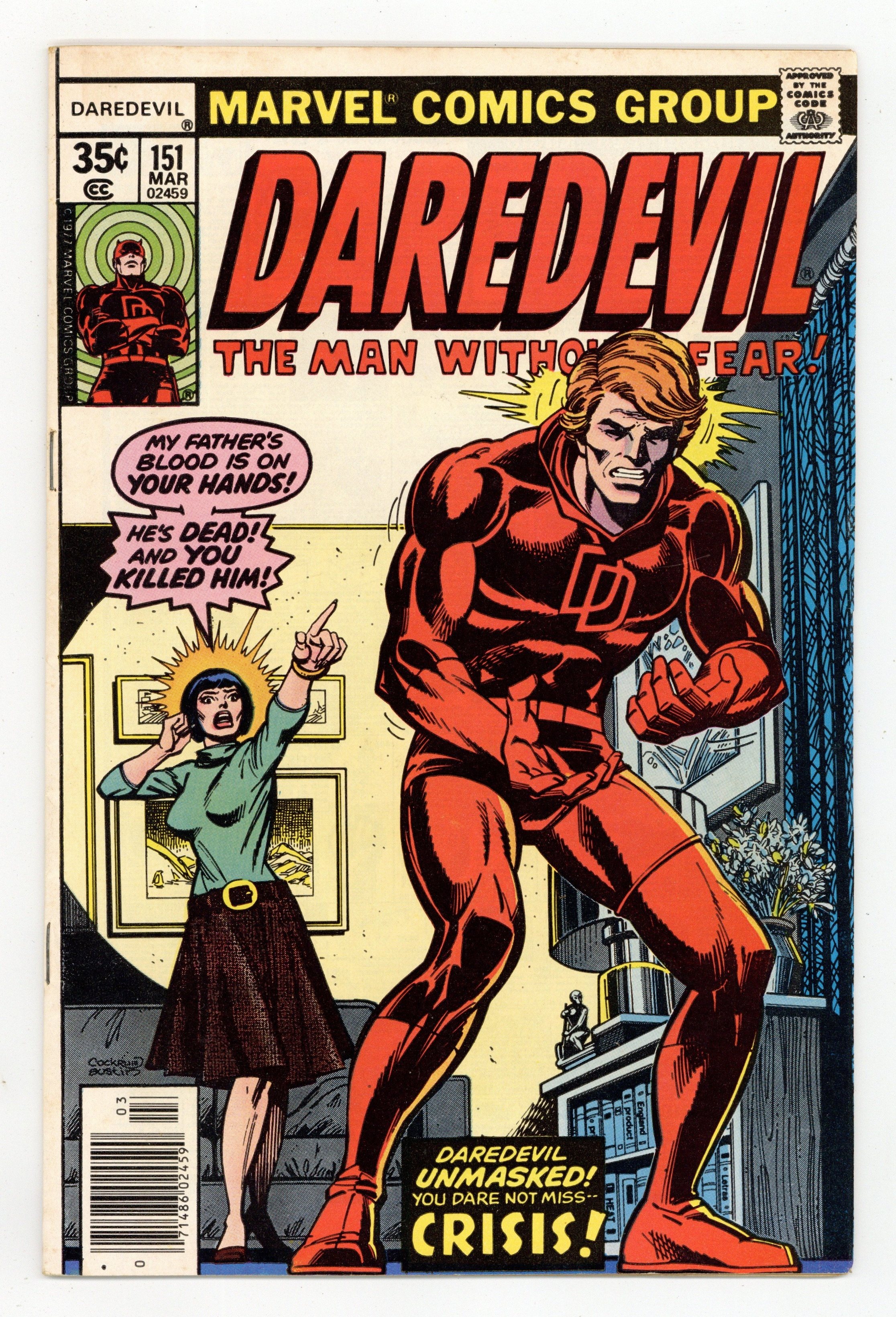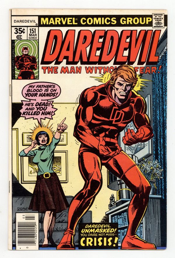 Tags: Marvel Legacy Numbering: Daredevil (part 151), Daredevil$6.80Cover pencils by Dave Cockrum, inks by Terry Austin. Crisis!, script by Gil Kane (plot), Jim Shooter (plot), and Roger McKenzie (script), pencils by Gil Kane (breakdowns) and Klaus Janson (finished art), inks by Klaus Janson; Heather learns that Matt is Daredevil and blames him for her father's death; Heather disappears. Hostess Cup Cake ad with Spider-Man. 36 pgs. Cover price $0.35. Cover price $0.35.