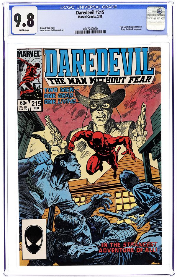 Cover art by David Mazzucchelli. Prophecy starring Daredevil, Two-Gun Kid (in flashback), Foggy Nelson, Rance Keeno (1st, in flashback), and Keeno (1st, his descendant), script by Denny O'Neil, art by David Mazzucchelli; DD finishes up a case started by Two-Gun Kid 100 years earlier back in the Wild West; first 8 pages are the Two-Gun Kid story done in grey tones with only yellow for color; story is the first to parallel DD and Two-Gun--Both lawyers named Matt who became masked heroes. 36 pgs. Cover price $0.60. Cover price $0.60.