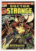 Tags: Marvel Legacy Numbering: Doctor Strange (part 185)$23.00Cover art by Frank Brunner. A Separate Reality!, script by Steve Englehart, pencils by Frank Brunner, inks by Dick Giordano; Strange battles the Soul-Eater; Tea party at the White Queen's (Valkyrie) castle, with Silver Surfer, Hulk, Sub-Mariner, Hawkeye, Spider-Man, Black Panther, Nick Fury, Ant-Man...Green Lantern?!; First appearance of the Knights of the Rostrum [unreal versions of Spider-Man, the Defenders (the Silver Surfer, the Sub-Mariner, the Hulk), Hawkeye, Nick Fury, the Black Panther, Ant-Man, and Captain Midnight] and the White Queen (an unreal version of the Valkyrie); Silver Dagger appearance. Considered an unofficial Crossover due to gloved hand wearing Green Lantern Ring on page 16 Cover price $0.25.