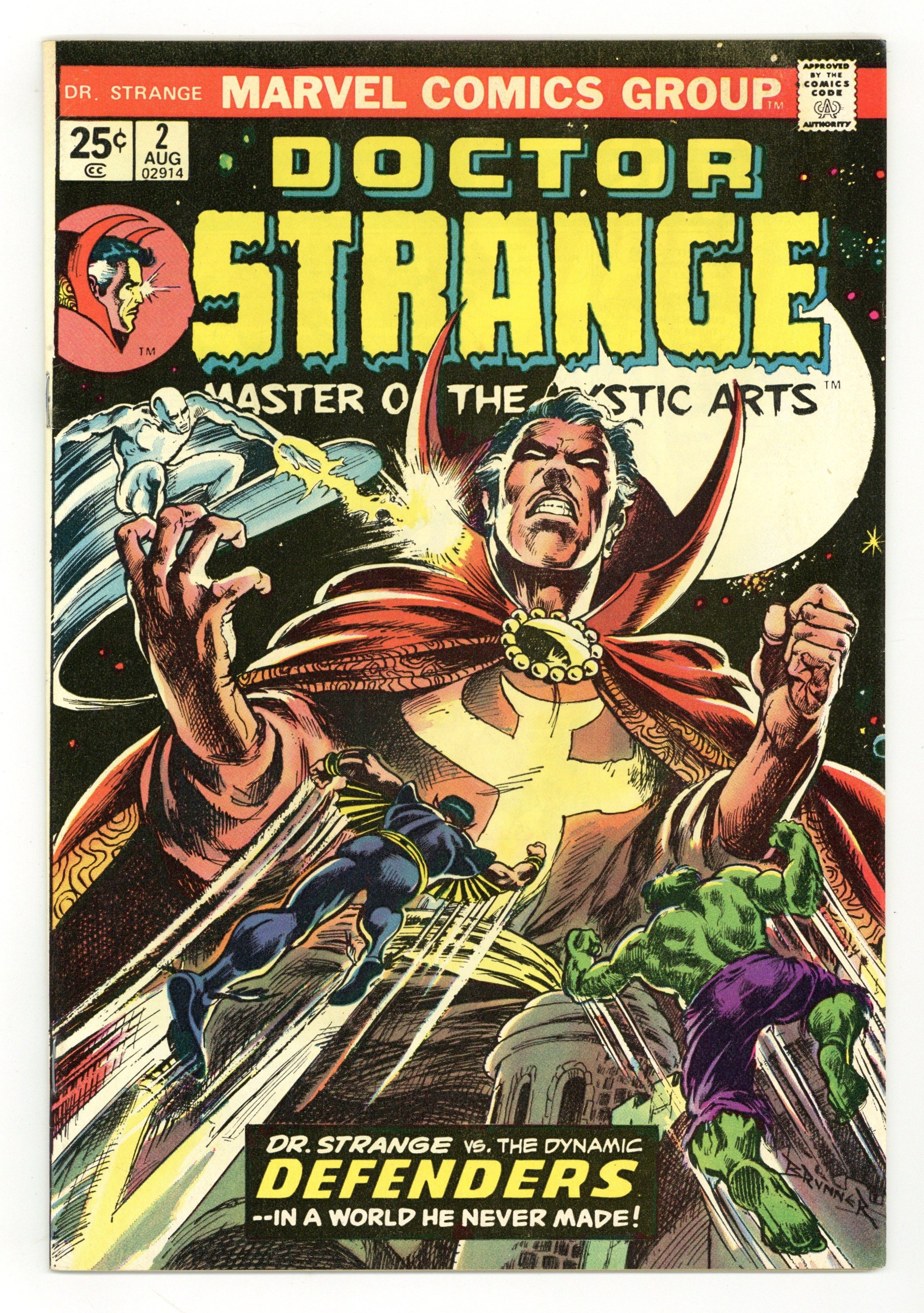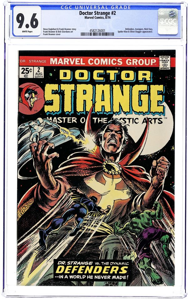Tags: Marvel Legacy Numbering: Doctor Strange (part 185)$14.00Cover art by Frank Brunner. A Separate Reality!, script by Steve Englehart, pencils by Frank Brunner, inks by Dick Giordano; Strange battles the Soul-Eater; Tea party at the White Queen's (Valkyrie) castle, with Silver Surfer, Hulk, Sub-Mariner, Hawkeye, Spider-Man, Black Panther, Nick Fury, Ant-Man...Green Lantern?!; First appearance of the Knights of the Rostrum [unreal versions of Spider-Man, the Defenders (the Silver Surfer, the Sub-Mariner, the Hulk), Hawkeye, Nick Fury, the Black Panther, Ant-Man, and Captain Midnight] and the White Queen (an unreal version of the Valkyrie); Silver Dagger appearance. Considered an unofficial Crossover due to gloved hand wearing Green Lantern Ring on page 16 Cover price $0.25.