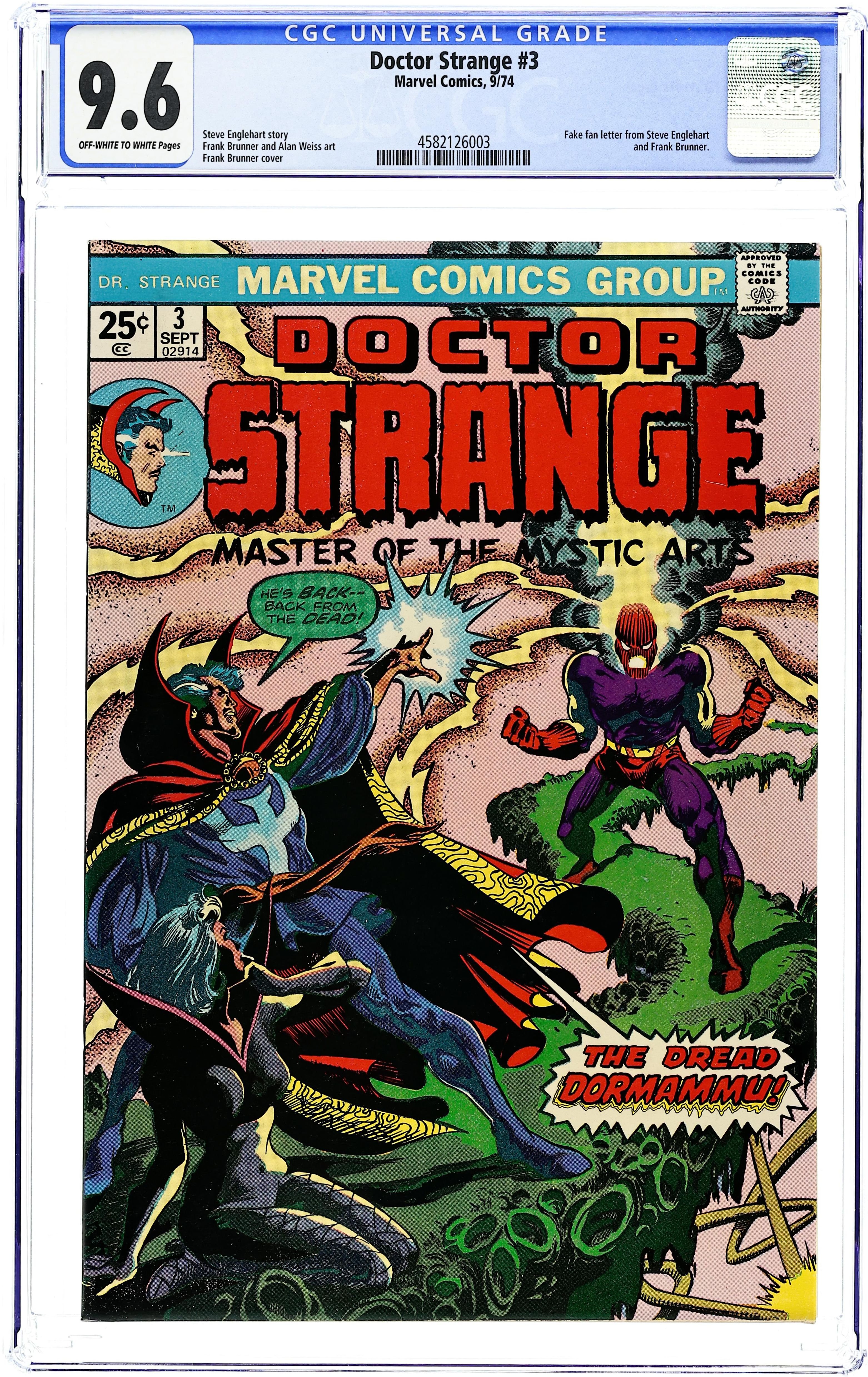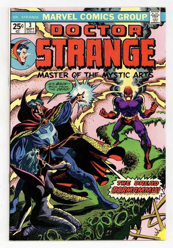 Most of this issue reprints "The Domain of the Dread Dormammu" (from Strange Tales 126) and "Duel With the Dread Dormammu" (from ST 127) by Stan Lee and Steve Ditko. There is a page and a half of new material, "Amidst the Madness," with script by Steve Englehart, pencils by Frank Brunner, inks by Alan Weiss. The letters page contains Marvel Value Stamp series A #14 (The Living Mummy). Brunner cover. Cover price $0.25.