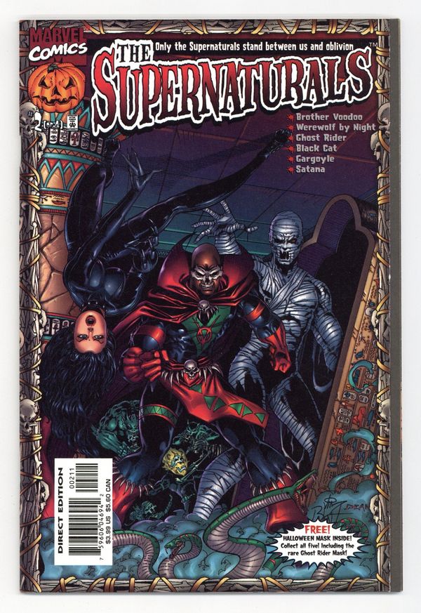 Halloween mask inside. Cover art by Jim Balent. "Meet The Supernaturals!" character bios, pencils by Ivan Reis, inks by Joe Pimental. Untitled story, script by Brian Pulido (storyteller; re-creator) and Marc Andreyko, pencils by Ivan Reis, inks by Joe Pimental; As Brother Voodoo gathers the five, one of them is captured by Jack O'Lantern and turned into a spy; Jack O'Lantern then goes to a museum and animates a knight's armor, a mummy, a T-Rex skeleton, and Neanderthal men to cause chaos!; And only the newly-christened Supernaturals can hope to stop them. 48 pgs., full color. Cover price $3.99.