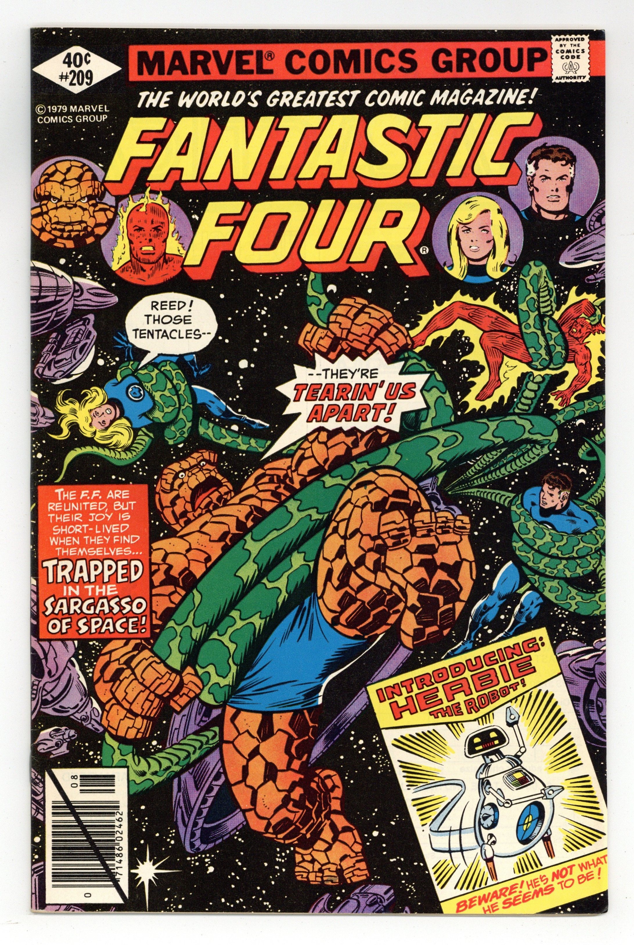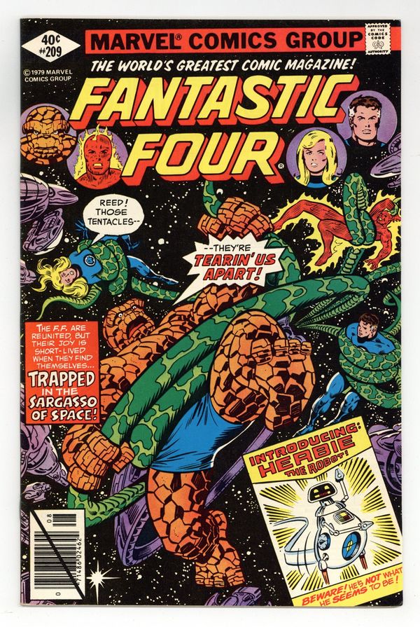 Direct Edition. "Trapped in the Sargasso of Space!" Written by Marv Wolfman. Pencils by John Byrne (first work on the series). Inks by Joe Sinnott. Cover by Keith Pollard and Joe Sinnott. Reed Richards has decided that only one person in the entire universe can prevent the Sphinx from destroying the Earth...Galactus! But first, can the FF find the Ravager of Worlds? And second, can they convince him to journey to Earth and save the planet? The quest begins in the Sargasso of space! Cameo appearances by Nova, Comet, Crimebuster, Diamondhead, and Powerhouse. Note: First appearance of Herbie the Robot, who was the fourth member of the Fantastic Four (instead of the Human Torch) on the FF's Saturday morning cartoon show. NOTE: To learn the final fate of Nova (Richard Rider) follow his story in the pages of Rom (1979) #24. - Odinson, mycomicshop Archivist. 36 pgs. Cover price $0.40.