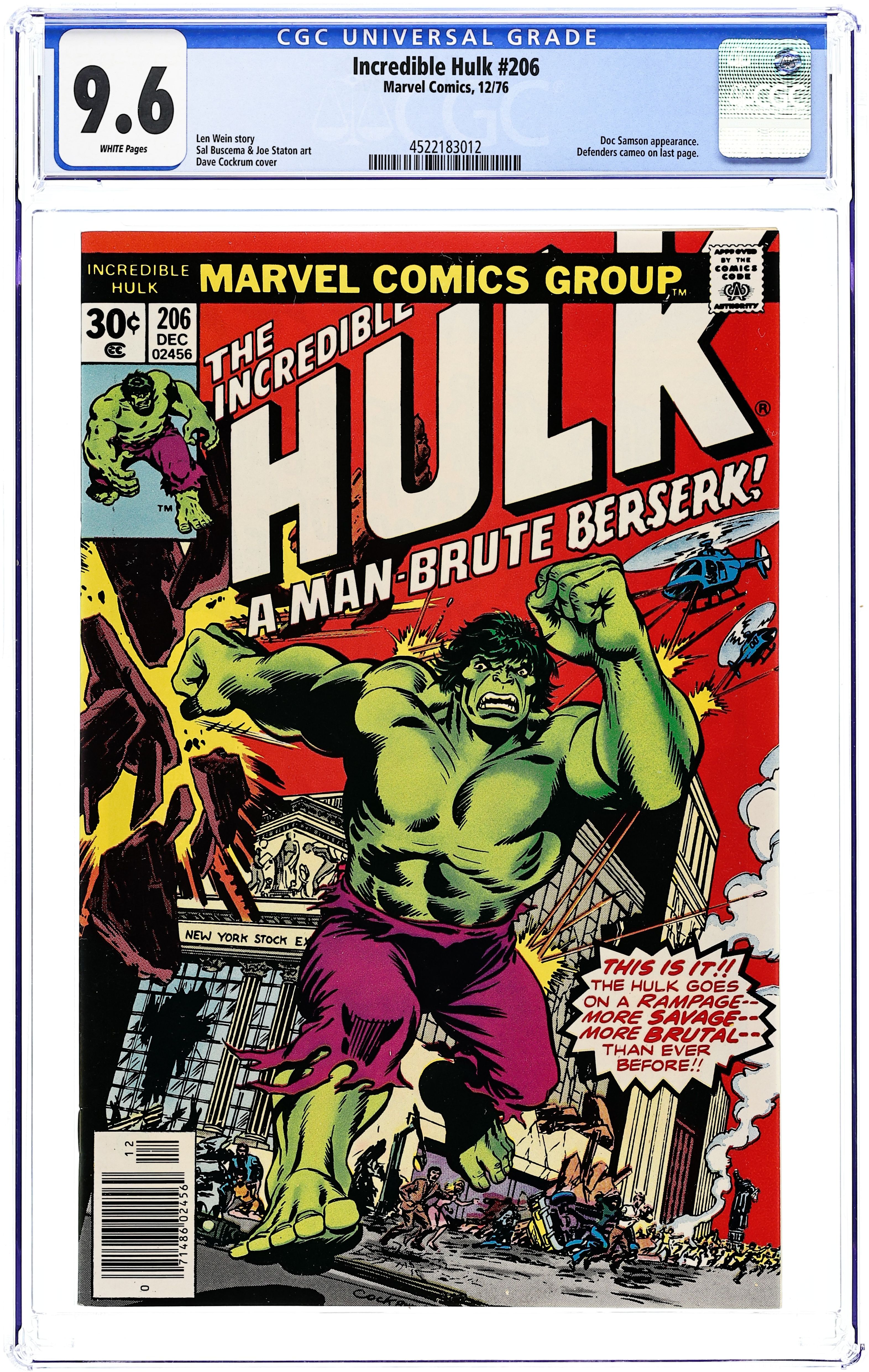 Cover by Dave Cockrum. "A Man-Brute Berserk!," script by Len Wein, pencils by Sal Buscema (breakdowns) and Joe Staton (finished art), inks by Joe Staton; Hulk goes leaping from Nevada to Manhattan, New York to find his friend Doctor Strange and ask him to use his magic and save Jarella; While in New York, soldiers start shooting at Jade Jaws and he goes nuts; As if he sensed it, Doctor Strange shows up with the other Defenders, Valkyrie, Nighthawk and the Red Guardian, to prevent the green giant from causing more damage. 36 pgs., full color. $0.30. Cover price $0.30.