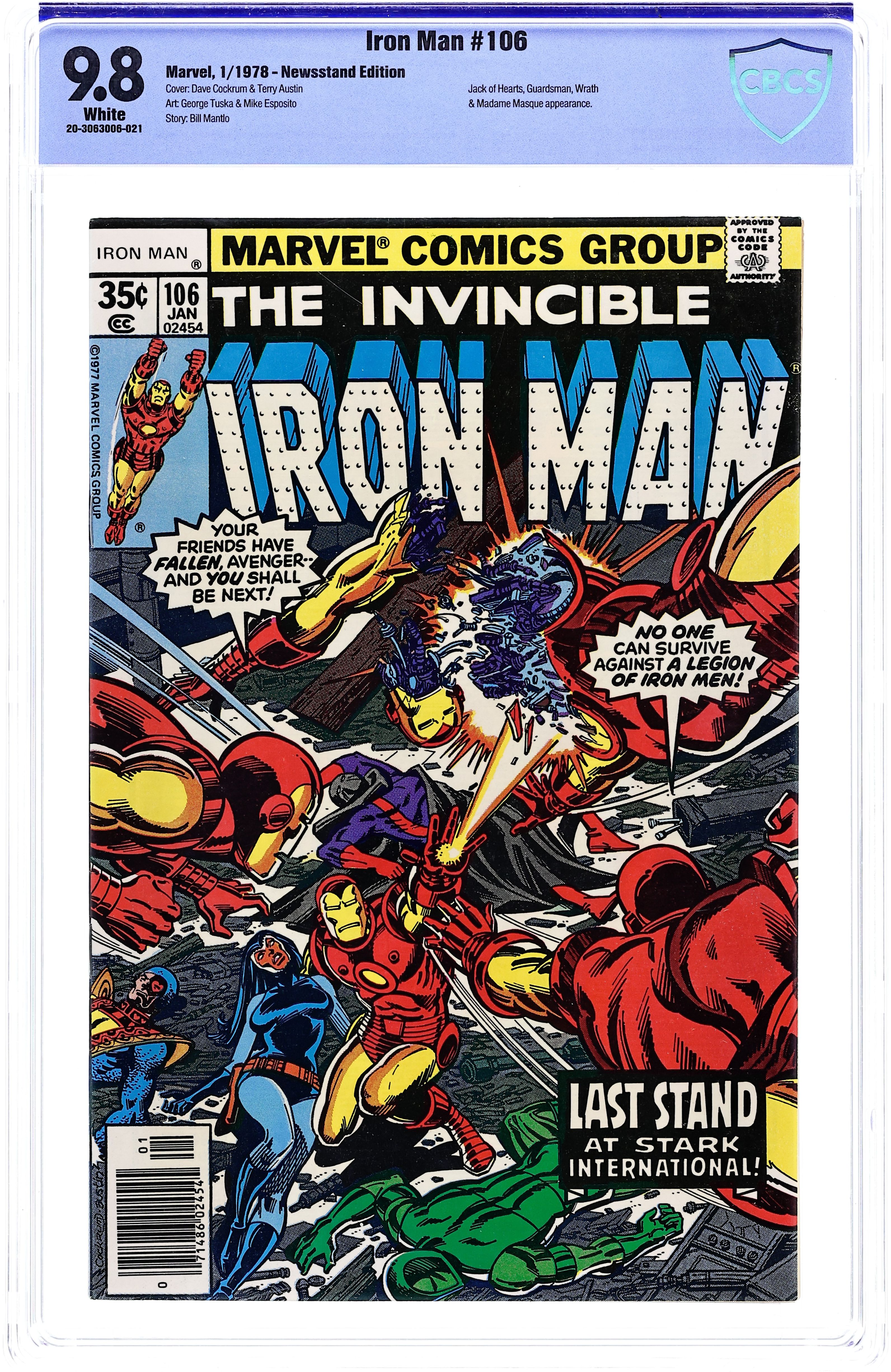 "Then There Came a War!" Part 4 of 5. Guest-starring Jack of Hearts. Script by Bill Mantlo. Pencils by George Tuska. Inks by Mike Esposito. Cover by Dave Cockrum and Terry Austin. It's an all-out assault on Stark International! As the Guardsman, Jack of Hearts, and Iron Man clash with the minions of Midas! The three heroes plus Madame Masque and the Wraith seem headed toward victory until Midas deploys his legion of Iron Men! And all of sudden Shell-Head's gang is under duress from a dozen Shell-Heads! One by one the good guys fall to the empty suits of armor under Midas' control until only Tony Stark remains! Now it's Midas' approaching victory that looks as good as gold! Appearances by Jean DeWolff, Eddie March, Jasper Sitwell, and Marianne Rodgers. (Note: This issue features George Tuska's final artwork on the series.) 32 pages. Cover price $0.35.