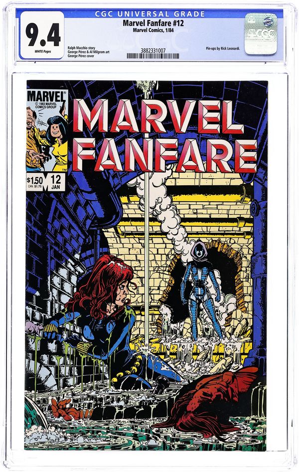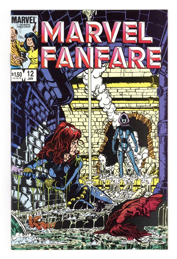 "The Web Tightens!" Part 3 of 4. Guest-starring the Black Widow. Script by Ralph Macchio. Pencils (and co-plotting) by George Perez. Inks by Al Milgrom. Cover by George Perez. Cornered in a Hong Kong curio shop by six assassins, the Black Widow puts on a dazzling display of her powers to escape! And after teaming up with SHIELD agent James Woo, the widow descends into the sewers to find the Iron Maiden! Natasha and Agent Woo successfully locate the Iron Maiden! But unexpectedly run into the dangerous Snapdragon too! Second story: "Marvel Annfare" Script by Roger Stern and Ann Nocenti (story idea). Art by Al Milgrom. Roger Stern laments the lack of editors present in the Marvel bullpen! So Ann recommends he don the star-spangled avenger's uniform to get inspired to write a Cap story for Marvel Fanfare! Cameo appearances by Bill Mantlo and Captain America. Special feature: This issue includes a portfolio of Rick Leonardi's artwork. Five full-page illustrations/pin-ups of Iron Man, the Silver Surfer, Storm, Thor, and Angel. (Notes: The back cover illustrates a scene from the second story with art by Al Milgrom. The inside back cover features an essay from Robbie Carosella describing the work that takes place in Marvel's stat room. The Iron Maiden returns in Captain America 388. Printed on glossy paper. The four-part Black Widow story was reprinted in 2016 in the trade paperback: Black Widow Web of Intrigue.) 32 pages. Cover price $1.50.