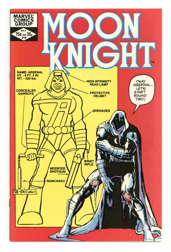 Tags: Marvel Legacy Numbering: Moon Knight (part 19)$10.00"Assault on Island Strange!" Written by Doug Moench, with art by Bill Sienkiewicz and Steve Mitchell. Cover by Bill Sienkiewicz. Moon Knight, Frenchie and Marlene infiltrate Nimrod's operations and Marlene is chosen to be one of his female bodyguards; Nimrod dons a deadly battle suit and begins calling himself Arsenal. 32 pages, FC. Cover price $0.75.