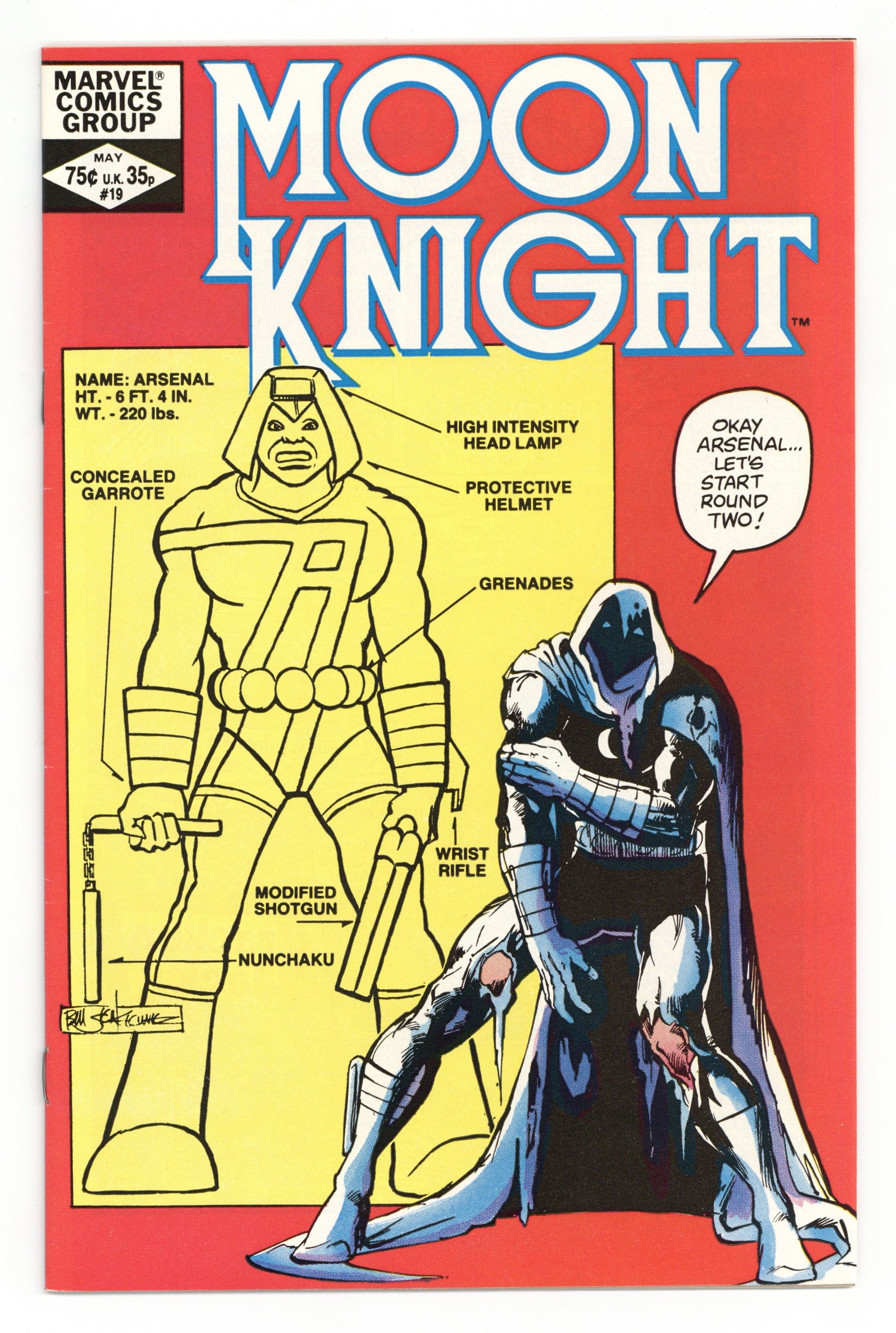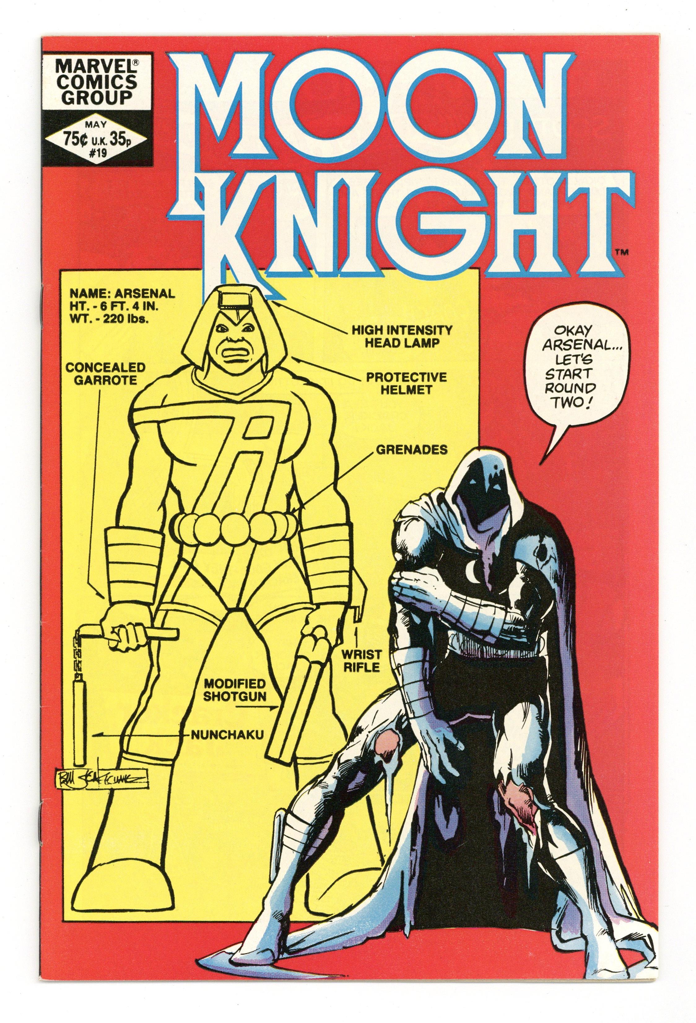 Tags: Marvel Legacy Numbering: Moon Knight (part 19)$12.00"Assault on Island Strange!" Written by Doug Moench, with art by Bill Sienkiewicz and Steve Mitchell. Cover by Bill Sienkiewicz. Moon Knight, Frenchie and Marlene infiltrate Nimrod's operations and Marlene is chosen to be one of his female bodyguards; Nimrod dons a deadly battle suit and begins calling himself Arsenal. 32 pages, FC. Cover price $0.75.