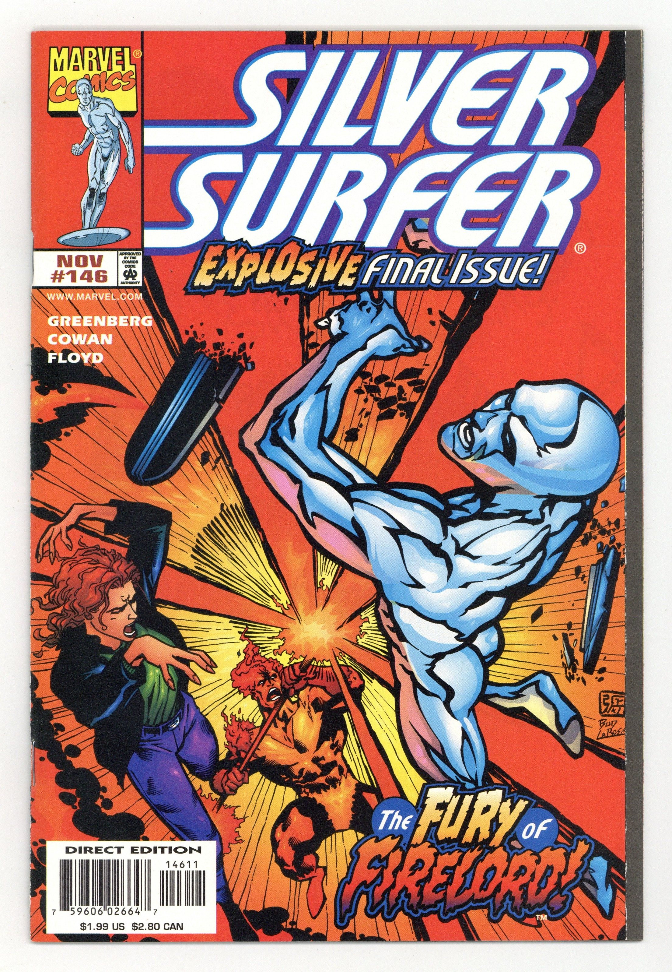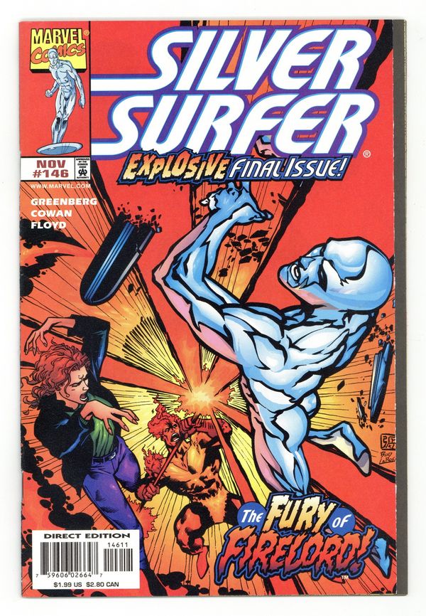 Final Issue. "Fire in the Sky!" Guest-starring Firelord. Cameos by the Avengers and Fantastic Four. Story by Tom DeFalco and Glenn Greenberg. Art by Denys Cowan and John Floyd. When a small country tests its nuclear capabilities and inadvertently destroy Firelord's sanctuary, the former Herald of Galactus seeks out those responsible. The only thing standing in the way of Firelord's retribution is another former Herald, the Silver Surfer. They have fought side by side as allies and against each as bitter rivals. When these two wielders of the Power Cosmic clash it makes for an explosive finale. Cover price $1.99.
