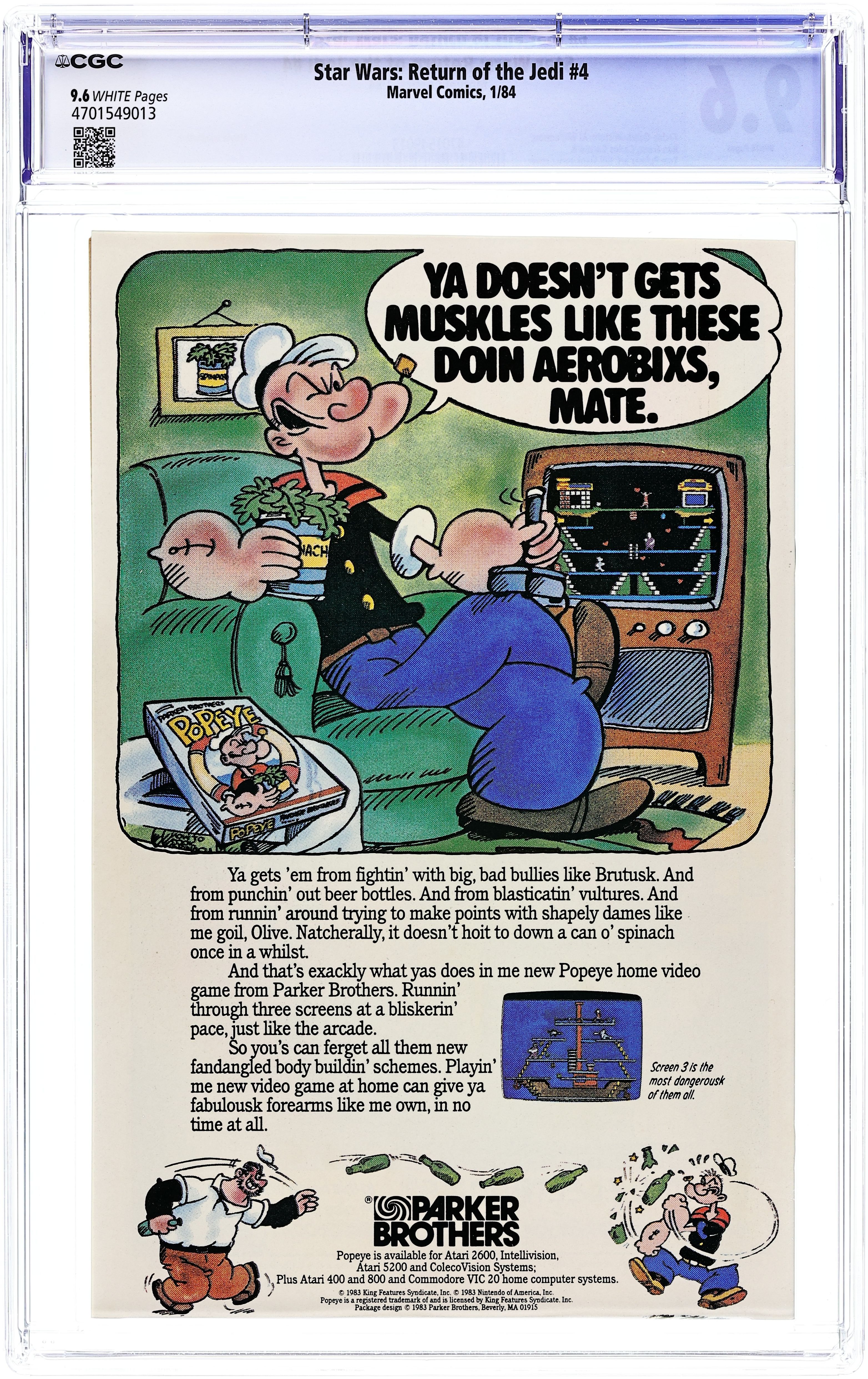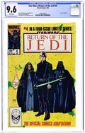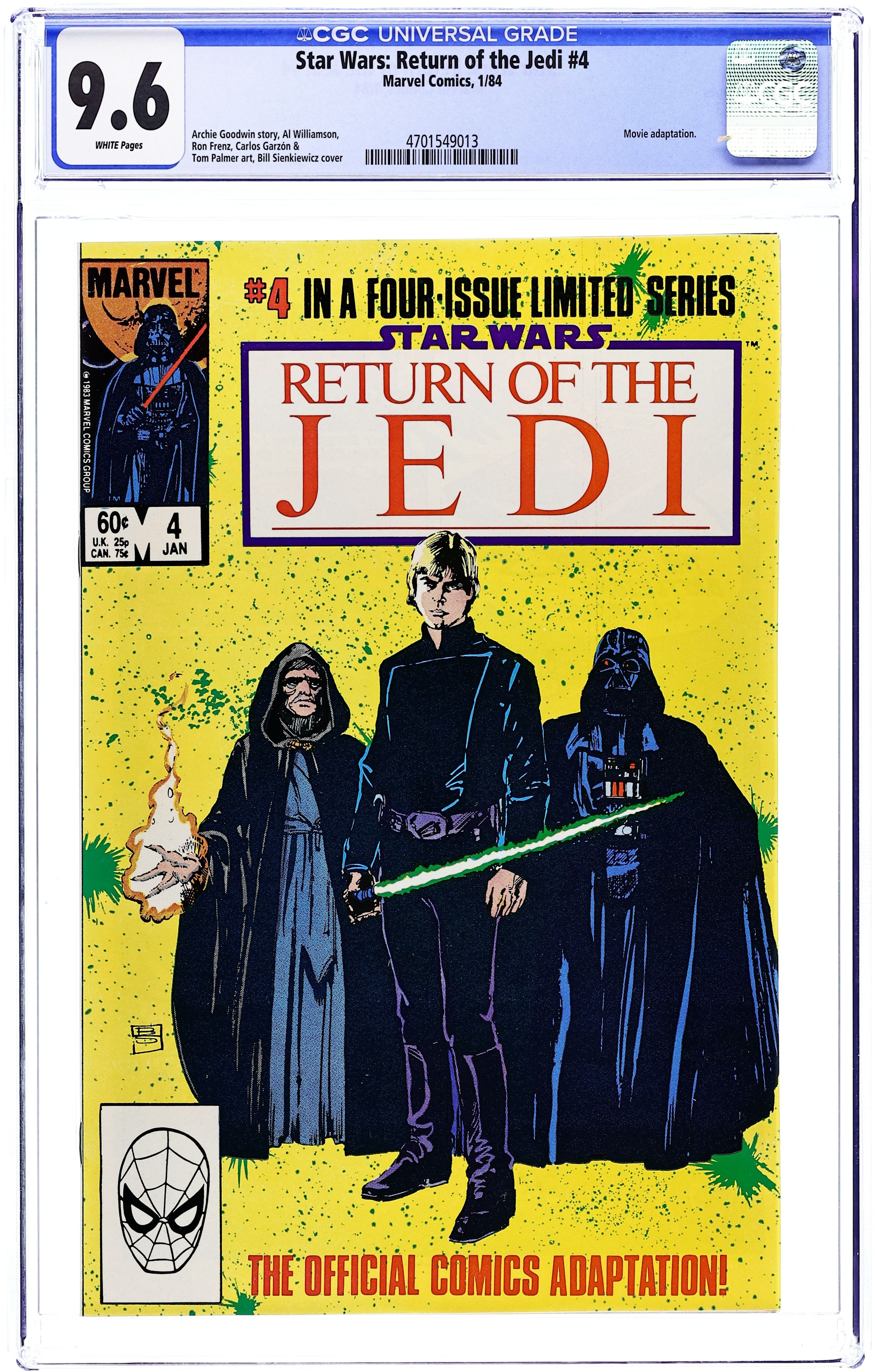 Direct Edition. Cover and splash page by Bill Sienkiewicz. "Chapter Four: The Final Duel!", script by Archie Goodwin, pencils by Al Williamson, Carlos Garzon, and Ron Frenz, inks by Al Williamson, Carlos Garzon, and Tom Palmer; The rebels attempt to destroy the second Death Star while Luke duels with Darth Vader and tries to find the good in him. Admiral Ackbar On The Bridge Of His Mon Calamari Battle Cruiser pinup by Rick J. Bryant. Ewok Warrior pinup by Rick J. Bryant. Rebel B-Wing Fighter pinup by Rick J. Bryant. Luke Skywalker, The Last Jedi pinup by Rick J. Bryant. Return Of The Jedi pinup by Bill Sienkiewicz. 36 pgs., full color. $0.60. Cover price $0.60.
