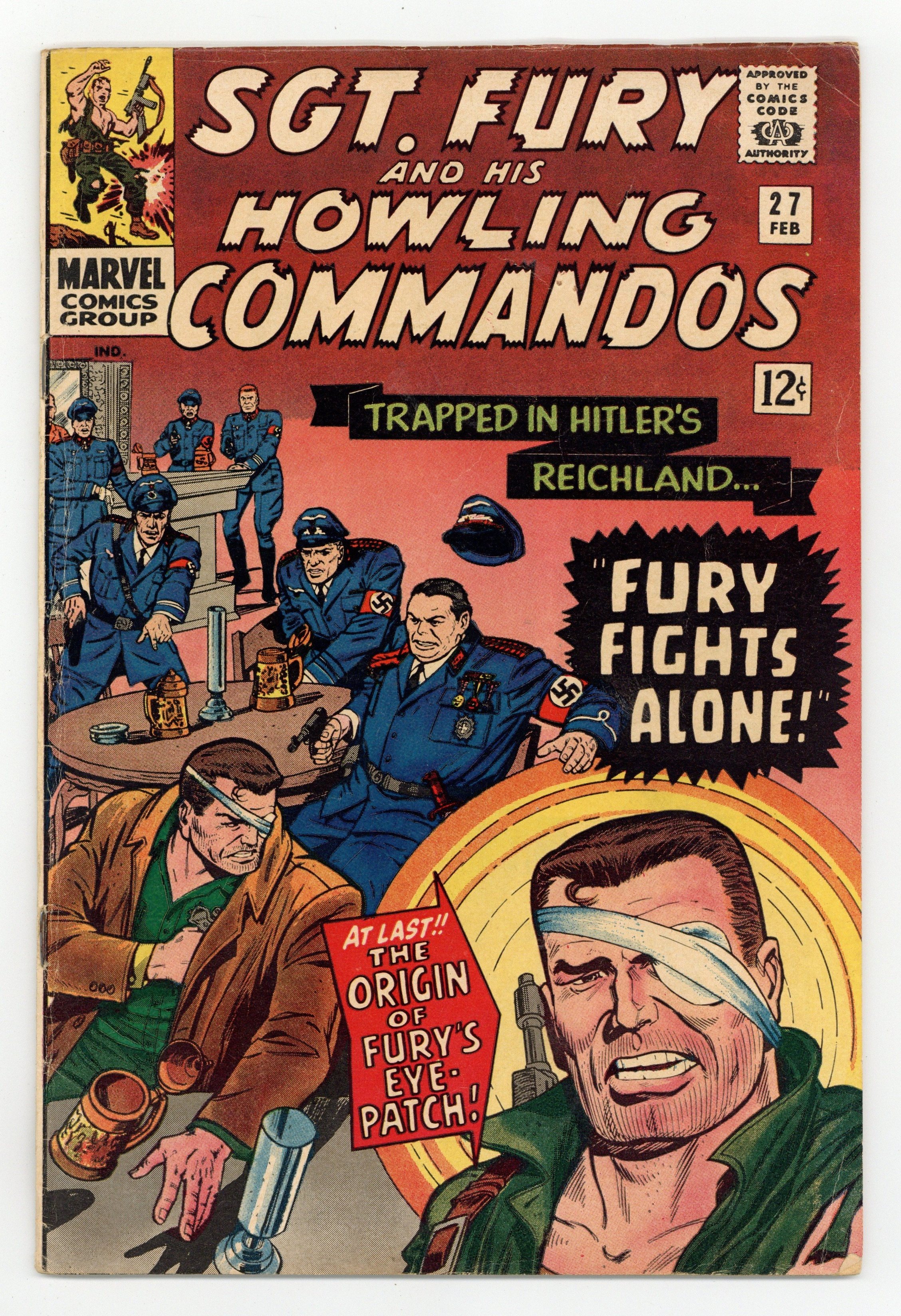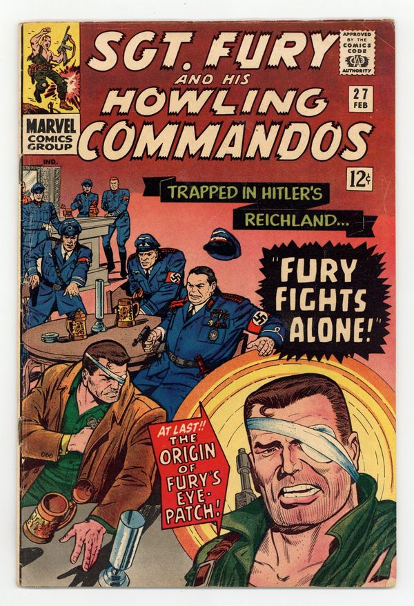 $15.50Cover pencils by Dick Ayers, inks by John Tartaglione. "Fury Fights Alone!", script by Stan Lee, pencils by Dick Ayers, inks by John Tartaglione; Trapped behind Nazi lines, Fury's left eye is injured when a grenade explodes too close to it; He rejects an operation that would preserve its vision; such surgery would keep him out of action for a full year at just the time when the Howlers need him most; His eye heals, but he is now guaranteed one day to lose its vision. 36 pgs., full color. $0.12. Cover price $0.12.