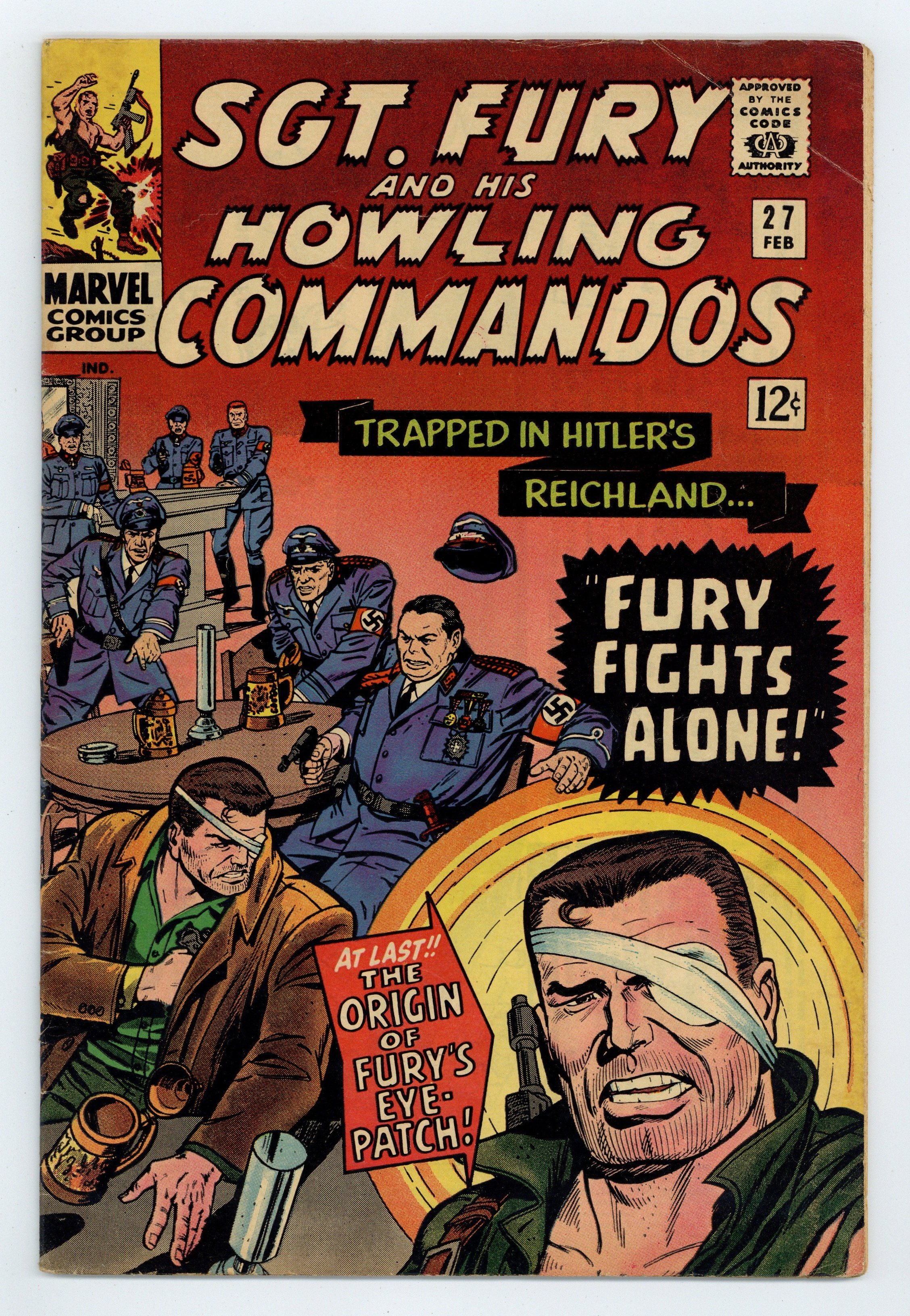 Cover pencils by Dick Ayers, inks by John Tartaglione. "Fury Fights Alone!", script by Stan Lee, pencils by Dick Ayers, inks by John Tartaglione; Trapped behind Nazi lines, Fury's left eye is injured when a grenade explodes too close to it; He rejects an operation that would preserve its vision; such surgery would keep him out of action for a full year at just the time when the Howlers need him most; His eye heals, but he is now guaranteed one day to lose its vision. 36 pgs., full color. $0.12. Cover price $0.12.