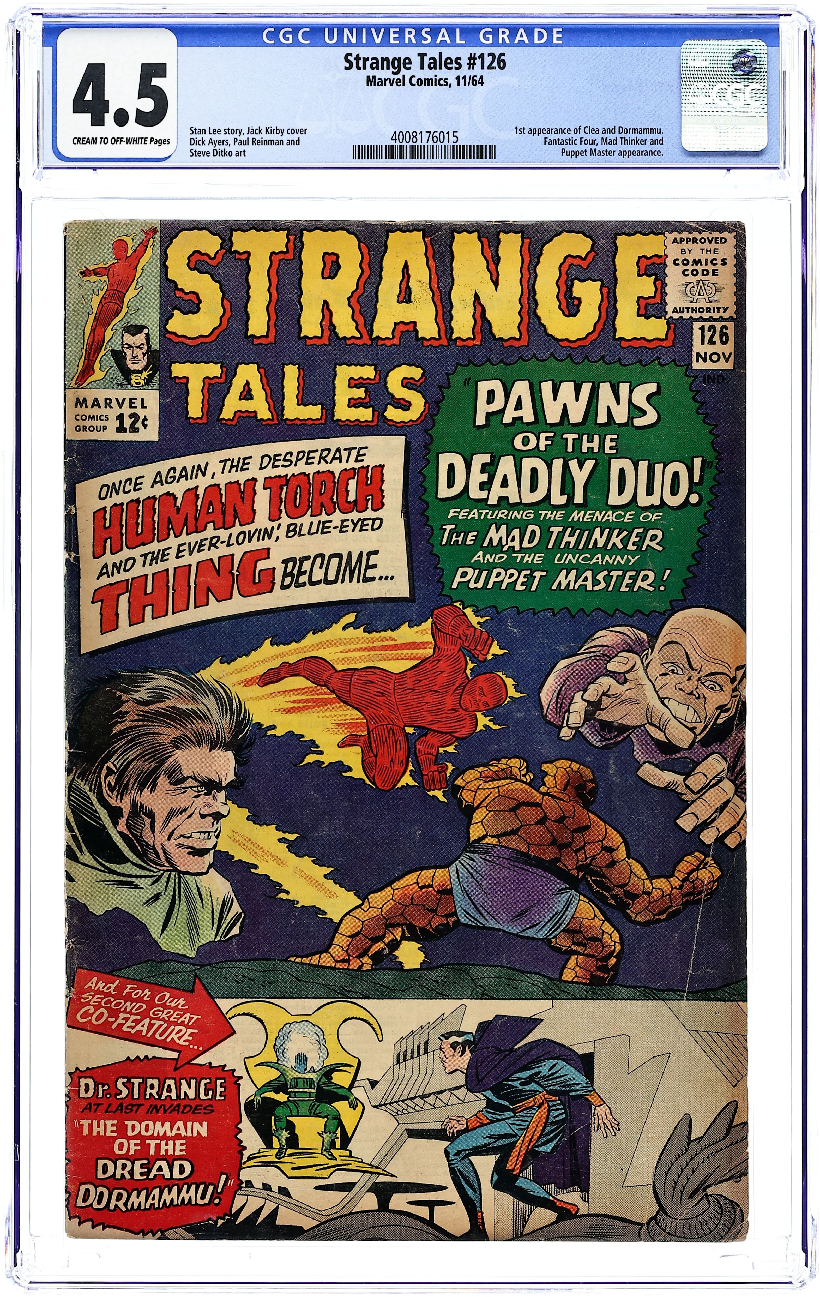 First appearance of Dormammu and Clea (named in issue 146). The Human Torch and the Thing face the Thinker and the Puppet Master in "Pawns of the Deadly Duo!" Script by Stan Lee, pencils by Dick Ayers, inks by Paul Reinman. Reed Richards and Sue Storm appearances. Doctor Strange stars in "The Domain of the Dread Dormammu!" Script by Lee, art by Steve Ditko. First letters page. Jack Kirby/Chic Stone cover. 36 pgs. Cover price $0.12.