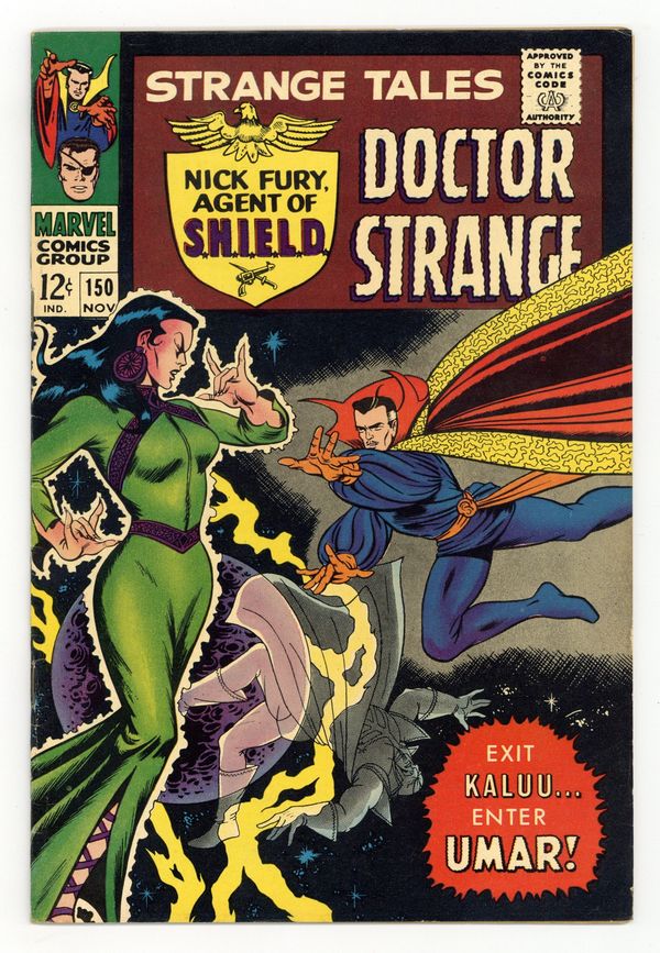Tags: Marvel Legacy Numbering: Doctor Strange (part 150)$18.00Cover art by Bill Everett. Nick Fury stars in "Hydra Lives!", script by Stan Lee and Jack Kirby (co-plot), pencils by Jack Kirby (layouts) and John Buscema (his first work for Marvel), inks by Frank Giacoia; Fury subjects himself to a dangerous test in order to prove that an atomic missile can be detonated long-distance by a sonic weapon which SHIELD believes HYDRA has; While both he & Dugan are recovering from injuries, Don Cabellero, at the urging of an undercover SHIELD man, invites Fury to a party in ancient Karnopolis in the Sahara Desert; Caballero is a disguise for the new Supreme Hydra, who is aware a SHIELD agent has invaded his ranks. First appearance of Umar (the sister of Dormammu) in "The Conquest of Kaluu!", script by Roy Thomas and Bill Everett (co-plot), art by Bill Everett; Kaluu realizes Strange and the Ancient One have escaped to the past of ancient Babylonia where The Ancient One obtains The Book Of The Vishanti; Before Kaluu can extinguish the Flames of the Faltine, Strange returns to the present with the mystic book which hurls his spell back to him; The Ancient One sends Kaluu into Limbo for all time; In The Dark Dimension Clea fears the onslaught of the Mindless One's freed from their prison with Dormammu gone. Letter to the editor from Carl Gafford. Merry Marvel Marching Society info and coupon. 36 pgs., full color. Cover price $0.12.