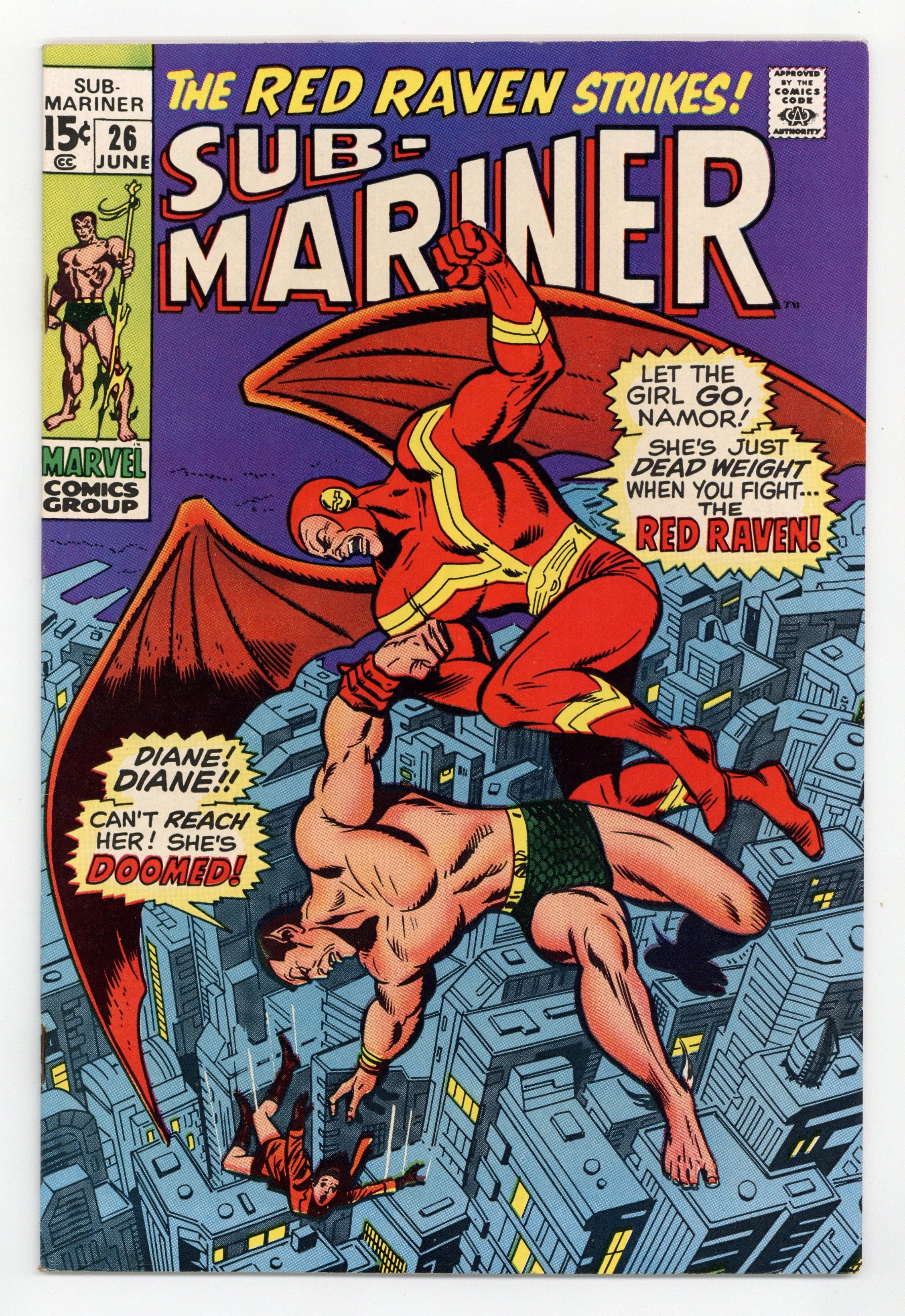 Cover pencils by Sal Buscema, inks by Mike Esposito. ""Kill!" Cried the Raven!", script by Roy Thomas, pencils by Sal Buscema, inks by Mike Esposito (as Joe Gaudioso); Namor makes his way to the surface world and seeks out Diane Arliss to help him find the Red Raven whose capsule was discovered by humans; Namor awakens the Red Raven from his suspended animation in hopes of recruiting an ally for Atlantis; Unfortunately, the Red Raven is keen on taking over the Earth; He battles past Namor and returns to his sunken island; Fortunately, the Sub-Mariner stops him from awakening his people and takes him down; However, a desperate Red Raven tries to awaken them only to discover that his people died years ago and the suspended animation has only preserved their bodies; In his rage, the Red Raven destroys his sunken island and Namor escapes to safety. Letter from Marc De Matteis. Promo for Alter Ego #10. 36 pgs., full color. $0.15. Cover price $0.15.