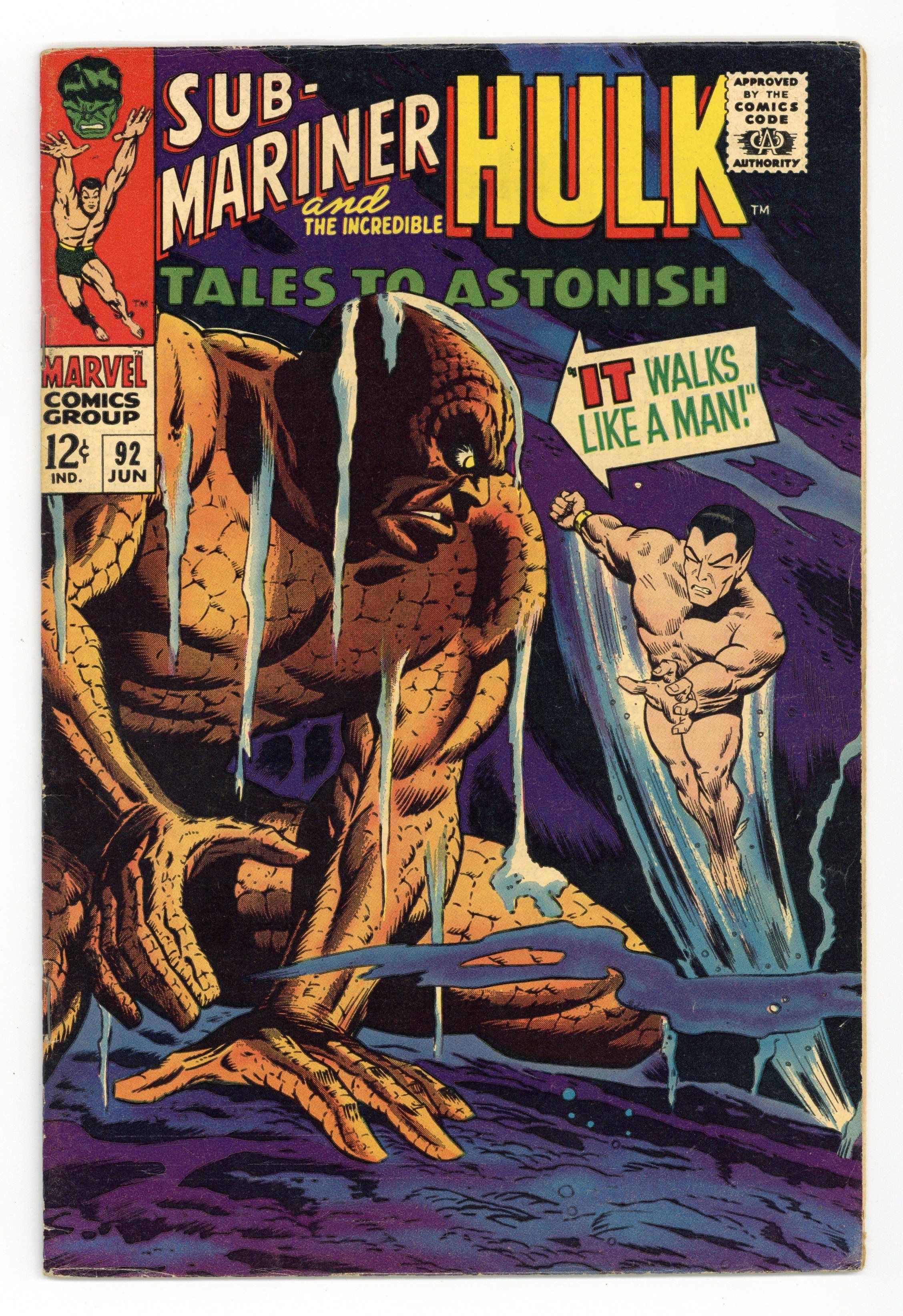 Cover by Don Heck and Dan Adkins. :It Walks Like a Man!, script by Stan Lee, art by Dan Adkins; When a passing ship dumps a radioactive barrel into Namor's realm, he realizes the danger it poses and takes it far away from Atlantis to throw it into a deep crevasse; Little does he know that the radiation in the barrel has awakened an ancient monster who begins to menace both the surface world and the world beneath the waves alike. Turning Point!, script by Stan Lee, art by Marie Severin and Frank Giacoia; Betty bemoans her loss of Bruce; Bruce, in disguise, bemoans his circumstances, then transforms into Hulk who flees his hotel room in typical Hulk fashion - through the wall; Outside, Hulk sees a 'flying saucer' and leaps to bring it down so the aliens can take him far from Earth; What he brings down is not a saucer but the mighty Silver Surfer! 36 pgs., full color. $0.12. Cover price $0.12.