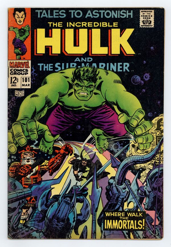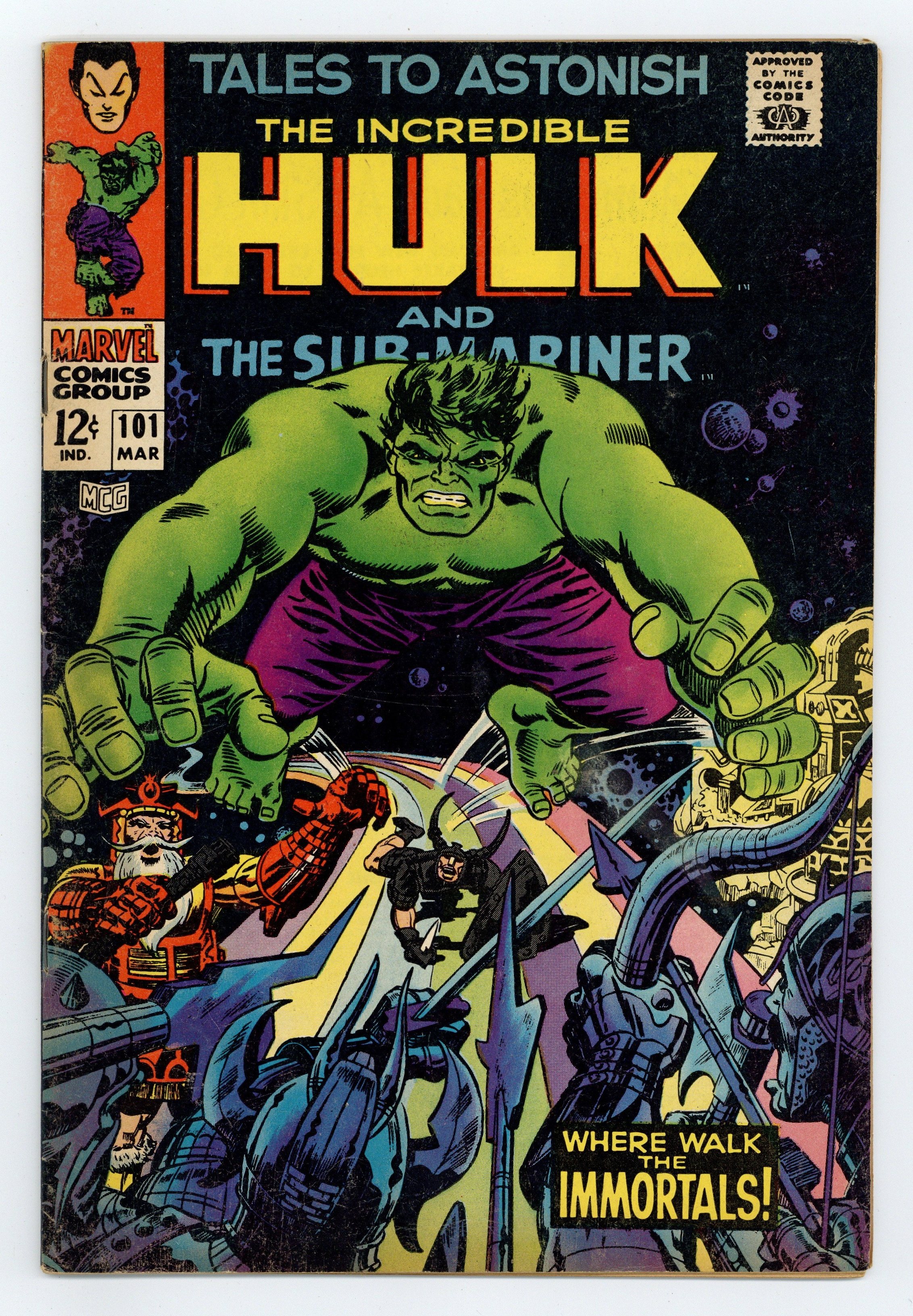 Cover by Marie Severin, Jack Kirby, Frank Giacoia, and Syd Shores. Where Walk the Immortals!, script by Stan Lee, art by Marie Severin and Frank Giacoia; Loki pulls the Hulk to Asgard to fight his father's forces; The Hulk battles the Warriors Three but in a moment of rare clarity, they discover that the jade giant is not really their enemy and refuse Loki's invitation to finish him off; Angered by his failure, Loki casts the Hulk into a bottomless pit. And Evil Shall Beckon, script by Archie Goodwin, art by Gene Colan and Dan Adkins; The Atlanteans abandon the second Atlantis; Namor goes to the Antarctic and finds Destiny hidden below the ice. 36 pgs., full color. The Hulk's solo adventures continue in the pages of Incredible Hulk (1962-1999 1st Series) #102. - Odinson, mycomicshop Archivist. Cover price $0.12.