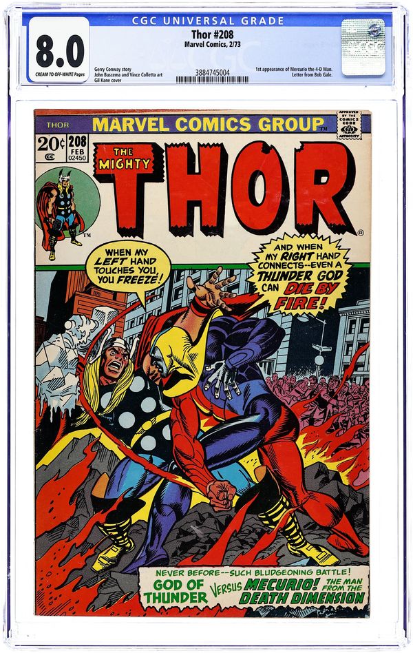 Cover pencils by Gil Kane, inks by Frank Giacoia. First appearance of the Fourth-Dimensional Man in "The Fourth-Dimensional Man!", script by Gerry Conway, pencils by John Buscema, inks by Vince Colletta; Thor and Hildegarde return to Avengers Mansion to think on what they must do; Meanwhile, Mr. Sarron returns to Don Blake's office and transforms himself into Mercurio by absorbing the ambient energy leftover from all of his transformations into Thor; But there is not enough energy, and he partly materializes; Passing over his old office, Thor notices a light inside and investigates, only to be attacked by Mercurio; While in Avengers Mansion, the Warriors Three notice on a monitor the battle, and go to help Thor; When they arrive, they begin to attack, but don't notice that Thor is gone. Appearances by the Vision, Hildegarde, Hogun, Fandral, and Volstagg. Cameos by Ego-Prime, Loki, the Absorbing Man, Odin, Sif, Karnilla, and Balder. 36 pgs., full color. $0.20. Cover price $0.20.