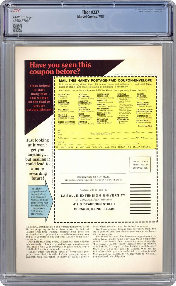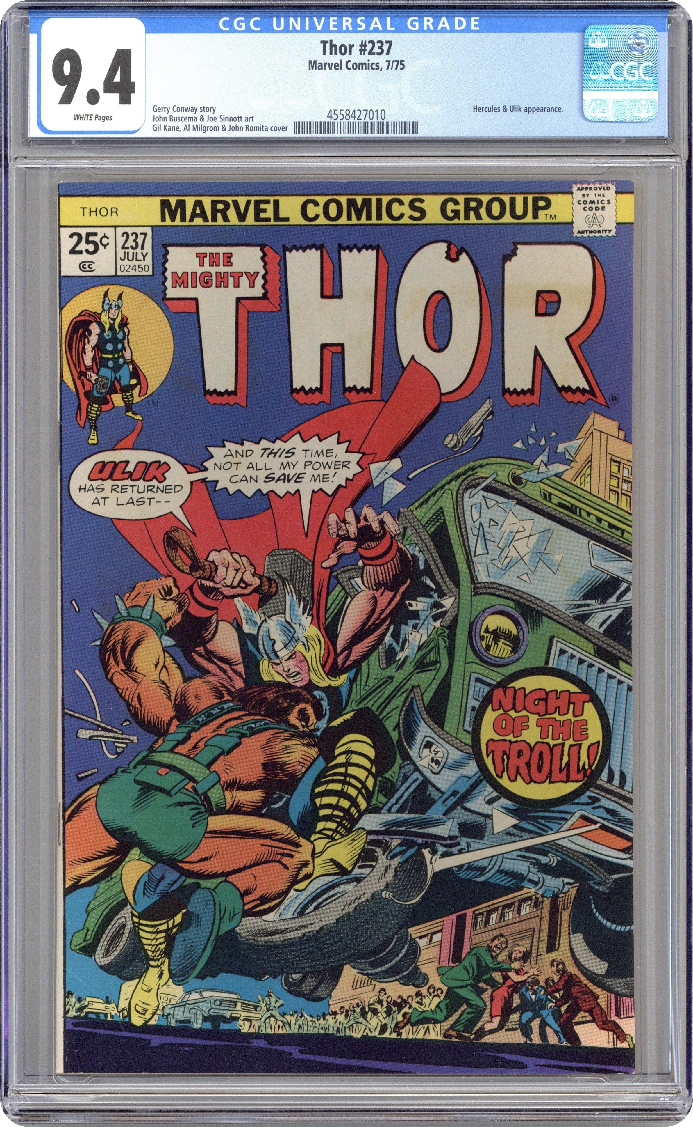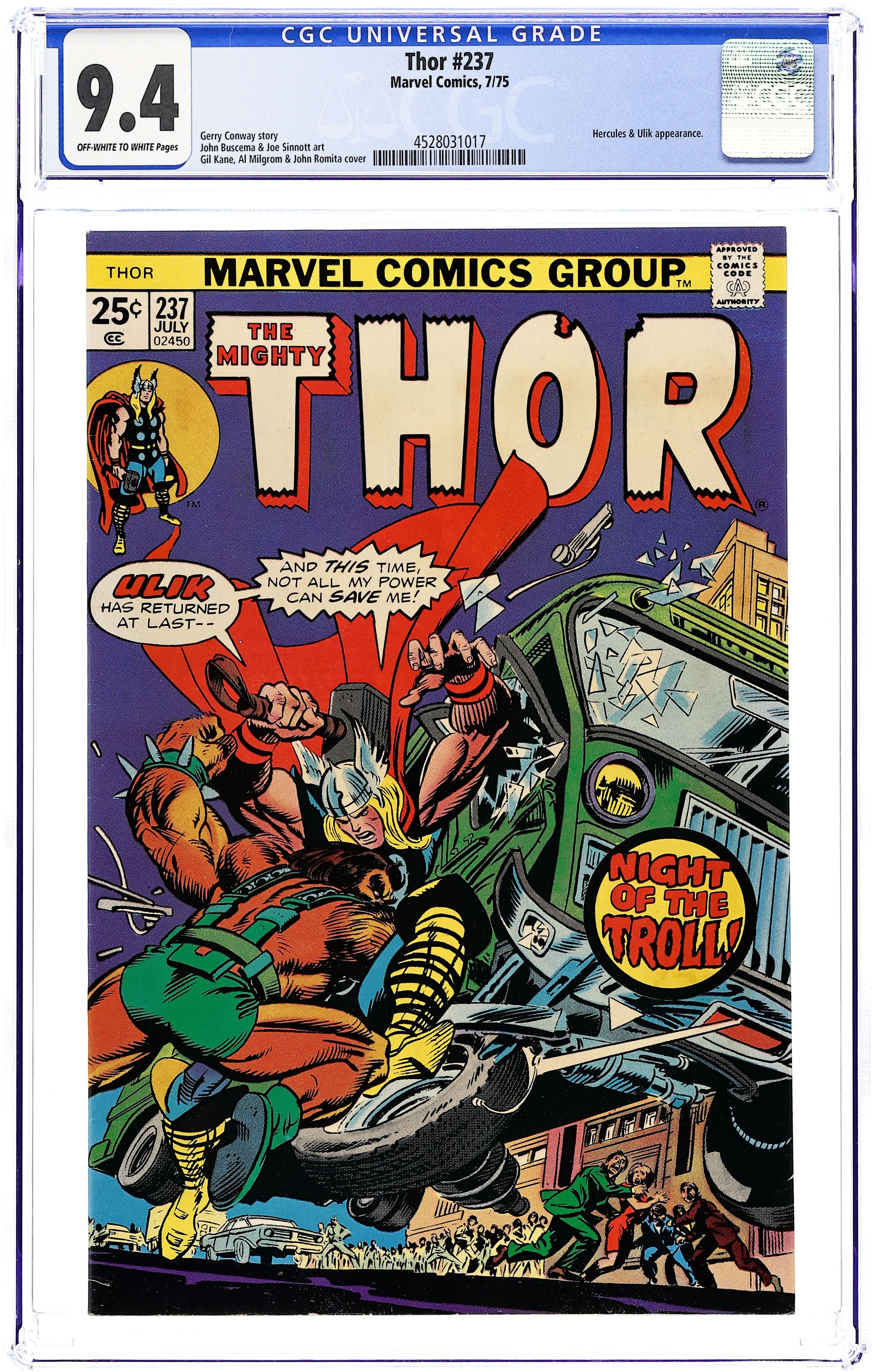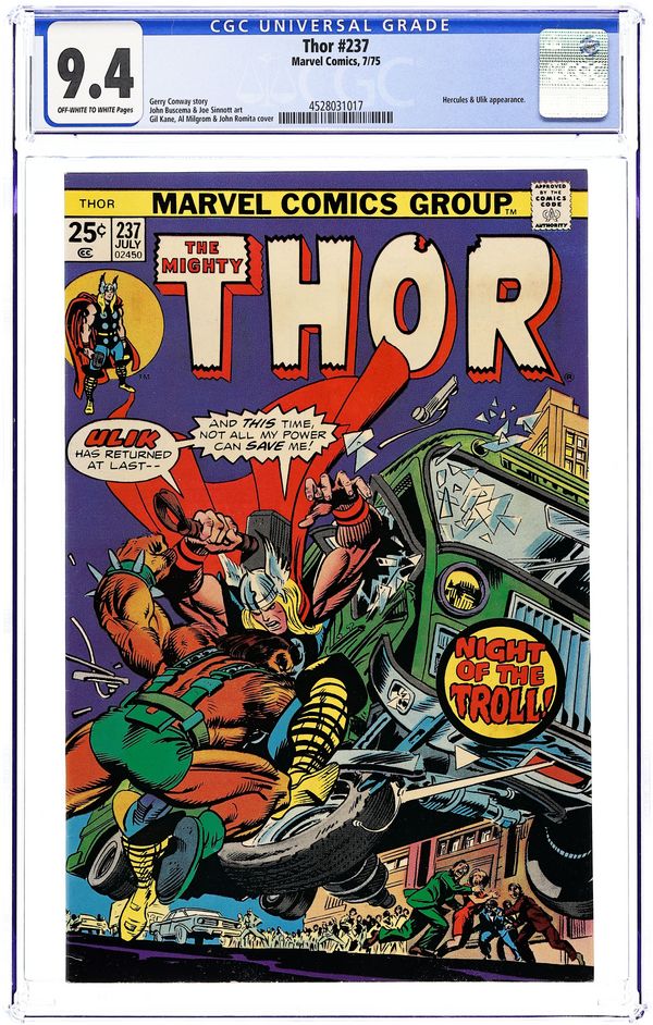 Cover pencils by Gil Kane and John Romita (alterations), inks by Al Milgrom and John Romita (alterations). "Ulik Unchained," script by Gerry Conway, pencils by John Buscema, inks by Joe Sinnott; Thor helps the cops catch some crooks, while Ulik watches; Elsewhere, Judith and Mr Heath speak to Orrin about his power and responsibilities; Back in New York, the trolls begin attacking the surface; While Thor is distracted battling Ulik, other trolls capture Jane, and Thor is forced to surrender. Letters to the editor from comics publisher Dean Mullaney and writer Peter Sanderson. The letters page also contains Marvel Value Stamp series A #18 (Volstagg). 36 pgs., full color. $0.25. Cover price $0.25.