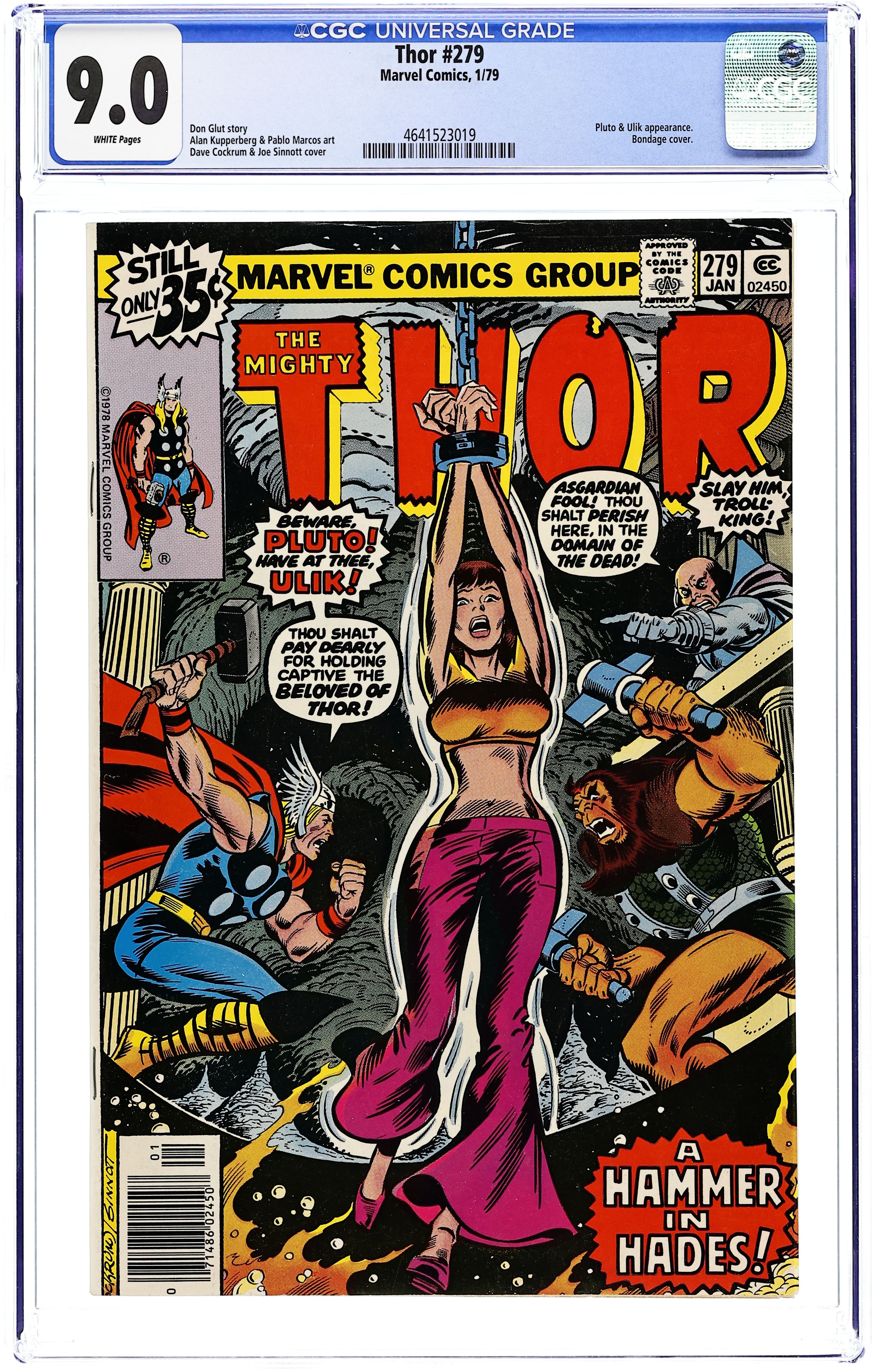 Cover pencils by Dave Cockrum, inks by Joe Sinnott. "A Hammer in Hades!", script by Don Glut, pencils by Alan Kupperberg (breakdowns) and Pablo Marcos (finished art), inks by Pablo Marcos; Pluto kidnaps Jane Foster and brings her to Hades, which leads Thor to Hades to rescue her; Pluto and Loki conspire to use Ulik to kill Thor. Bullpen Bulletins. Letter to the editor from writer Cat Yronwode. "Captain Marvel Meets the Dreadnought" Hostess snack cakes ad. 36 pgs., full color. $0.35. Cover price $0.35.