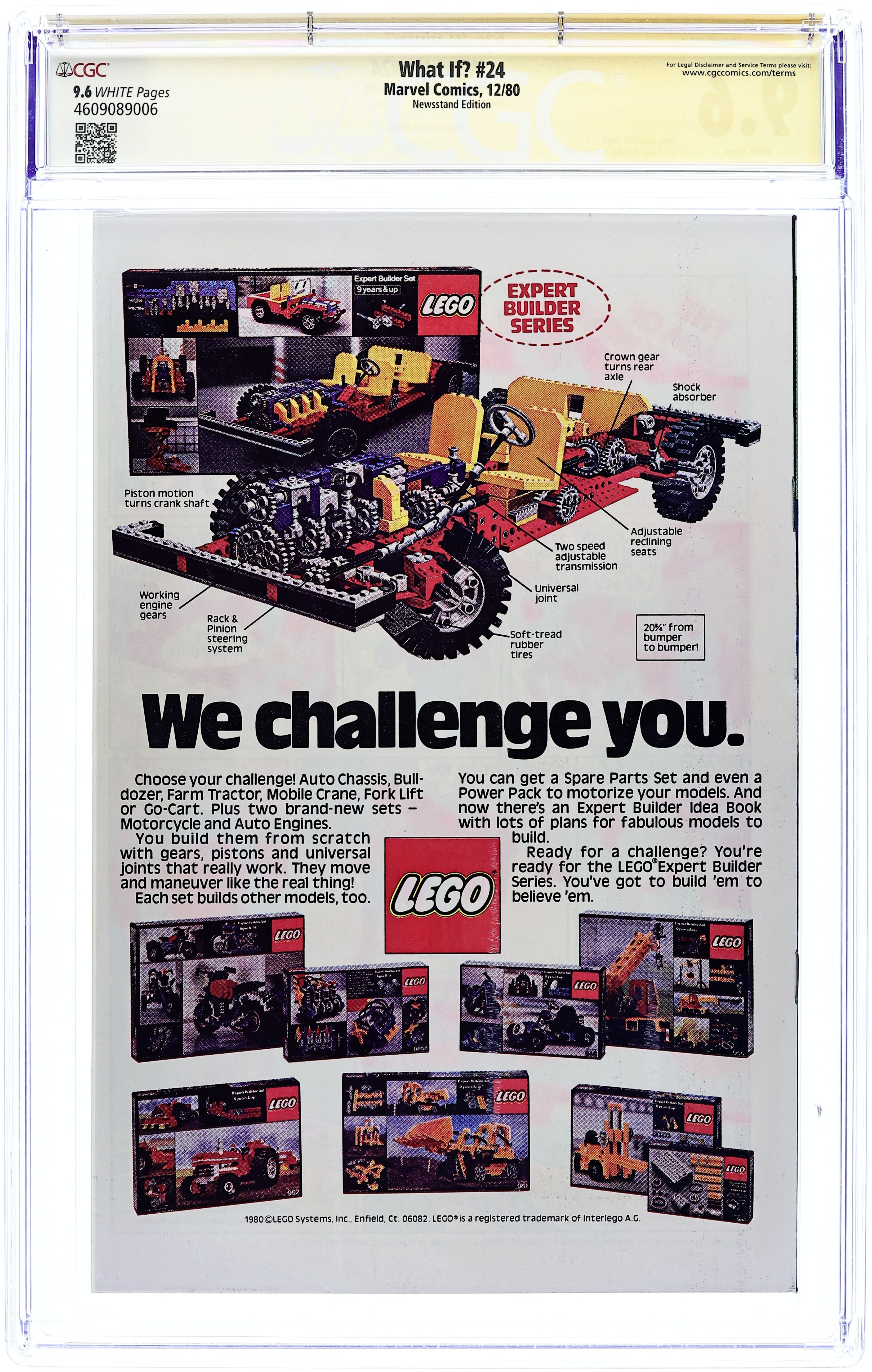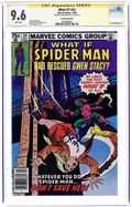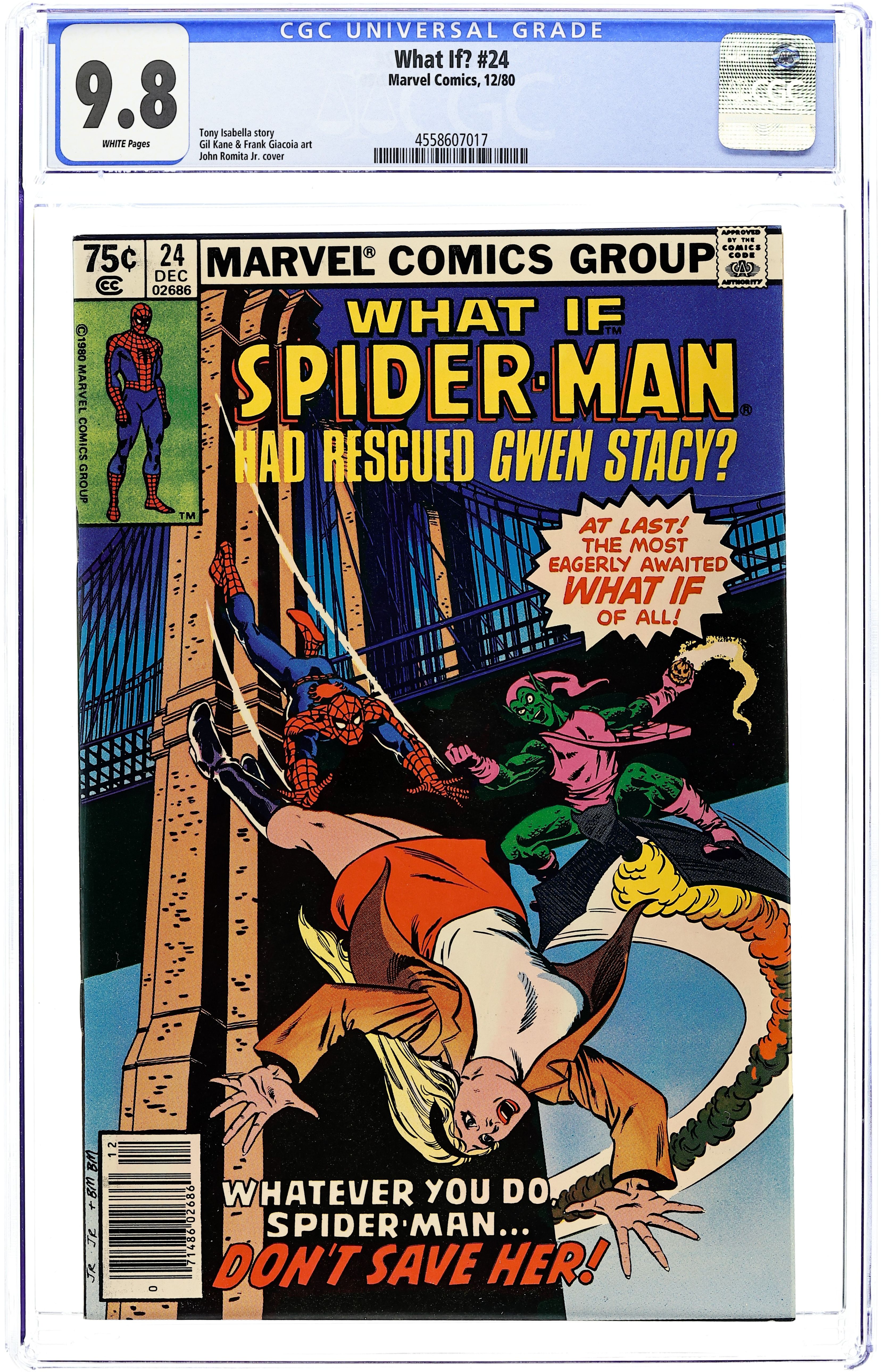Newsstand Edition. "What If... Gwen Stacy had Lived?" Script by Tony Isabella. Art by Gil Kane (breakdowns), Frank Giacoia (finishes), Carl Gafford (assists), Peter Poplaski (assists), Ron Zalme (assists), and Joe Albelo (assists). Cover by John Romita Jr. and Bob McLeod. In the landmark story in Amazing Spider-Man 121 & 122, Gwen Stacy died during Spider-Man's heroic battle vs. the Green Goblin atop the Brooklyn Bridge. Many times since both the web-slinger and his fans have wondered how different Peter Parker's life would have turnedout if Gwen had lived. In this issue the Watcher presents an alternate reality in which Spider-Man saves Gwen. After the Green Goblin knocks Gwen off the bridge, the wall-crawler jumps from the support column to catch her with his arms instead of his webbing! And in spectacular fashion, Spider-Man grabs his girlfriend before they hit the water! Upon returning to safe ground, Peter proposes... and Gwen accepts! Later on the web-spinner tracks down the Green Goblin and (with help from Harry) convinces him to surrender! Everything is going great for the Amazing Spider-Man! Several weeks later Peter and Gwen exchange wedding vows! But at the end of their ceremony, J. Jonah Jameson barges in with breaking news! Very damning news for one Peter Parker! As the cover caption forewarns... sometimes the past is best left in the past. Cameo appearances by Joe Robertson, Flash Thompson, Betty Brant, Ned Leeds, and Aunt May. Backup story: "The First Eternals!" Script by Ralph Macchio. Art by Rich Buckler (breakdowns) and Chic Stone (finishes). (Note: Both stories were reprinted in 2007 in the trade paperback: What If? Classic 4.) 52 pages. Cover price $0.75.