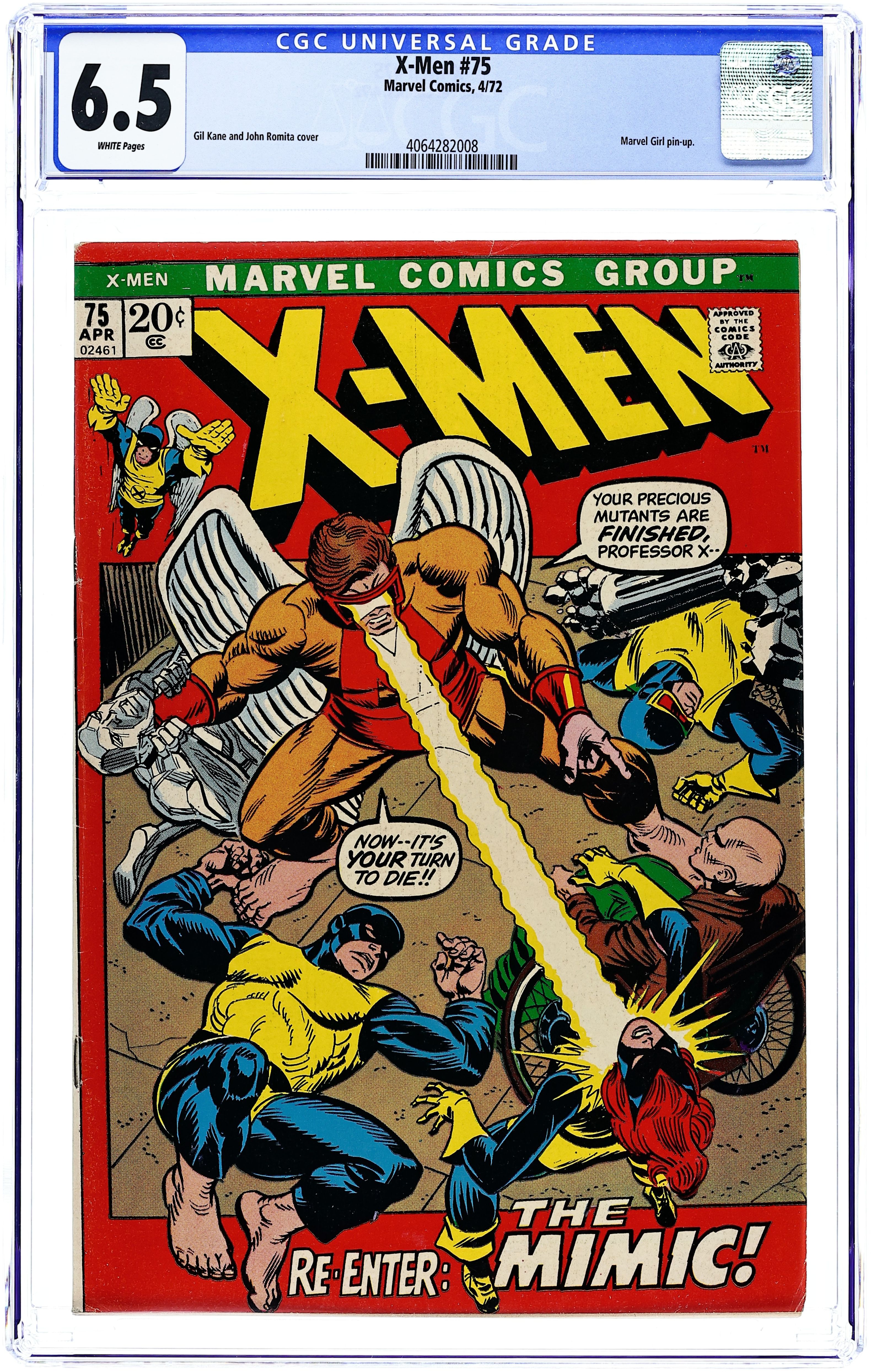 Cover pencils by Gil Kane, inks by John Romita. Re-Enter: The Mimic, script by Roy Thomas, pencils by Werner Roth, inks by Dick Ayers; Angel rests in the way of getting the wake of getting hit with Cyclops' optic blast; Mimic recovers his powers and memories; the X-Men battle the Puppet Master; Cameos by Spider-Man and the Fantastic Four; ; reprinted from issue 27.. A Marvel Masterwork Pin-Up of Jean Grey, pencils by Jack Kirby, inks by Chic Stone. 36 pgs. $0.20. Cover price $0.20.