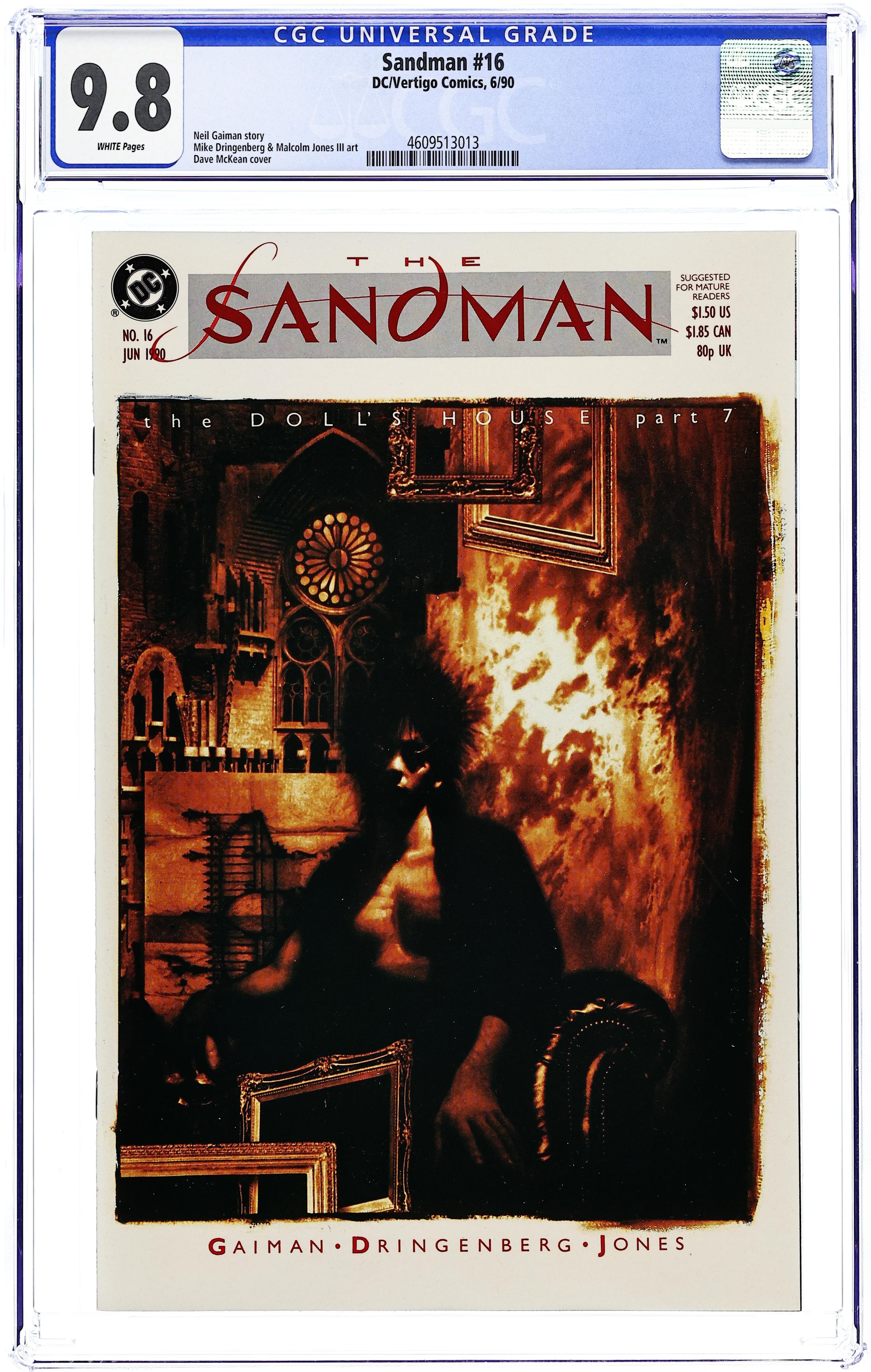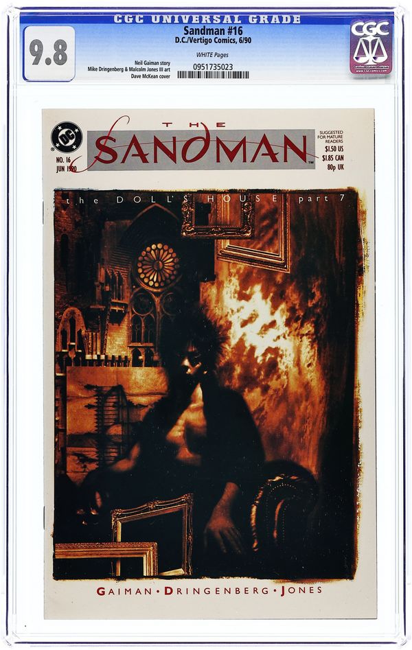 The Doll's House, Part 7 of 7. The secret of the Doll's House and Gilbert's mysterious background are revealed as Rose finally meets the Sandman. Written by Neil Gaiman, with art by Mike Dringenberg and Malcolm Jones III. Painted cover by Dave McKean. Suggested for Mature Readers. New Format. Cover price $1.50.